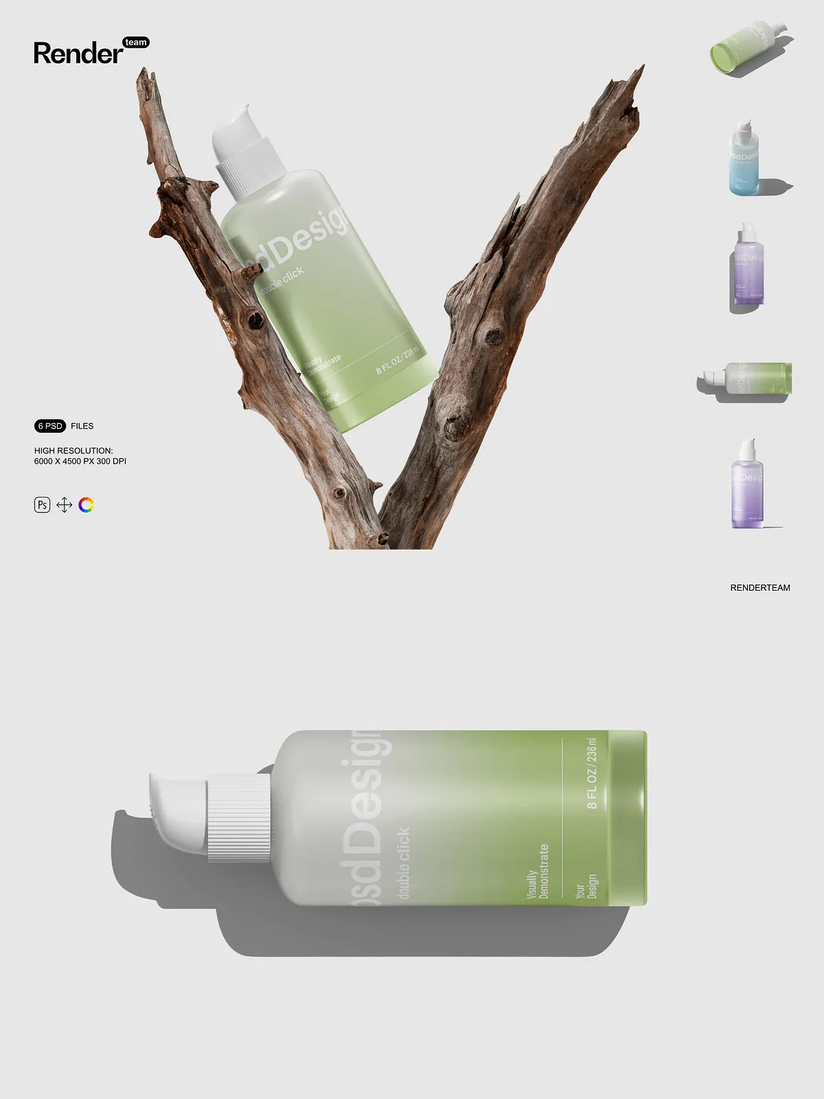 The Cosmetic Bottle Mockup Set requires Adobe Photoshop with Smart Object support, layer styles, and blending modes. For best performance and full feature support, use a current Creative Cloud release. Any preview images, stock photos, or fonts shown in sample previews are not included and require separate licensing. The PSD files are optimized for Photoshop and may not function identically in non-Adobe editors.