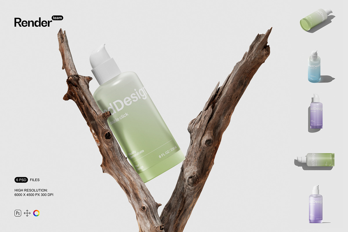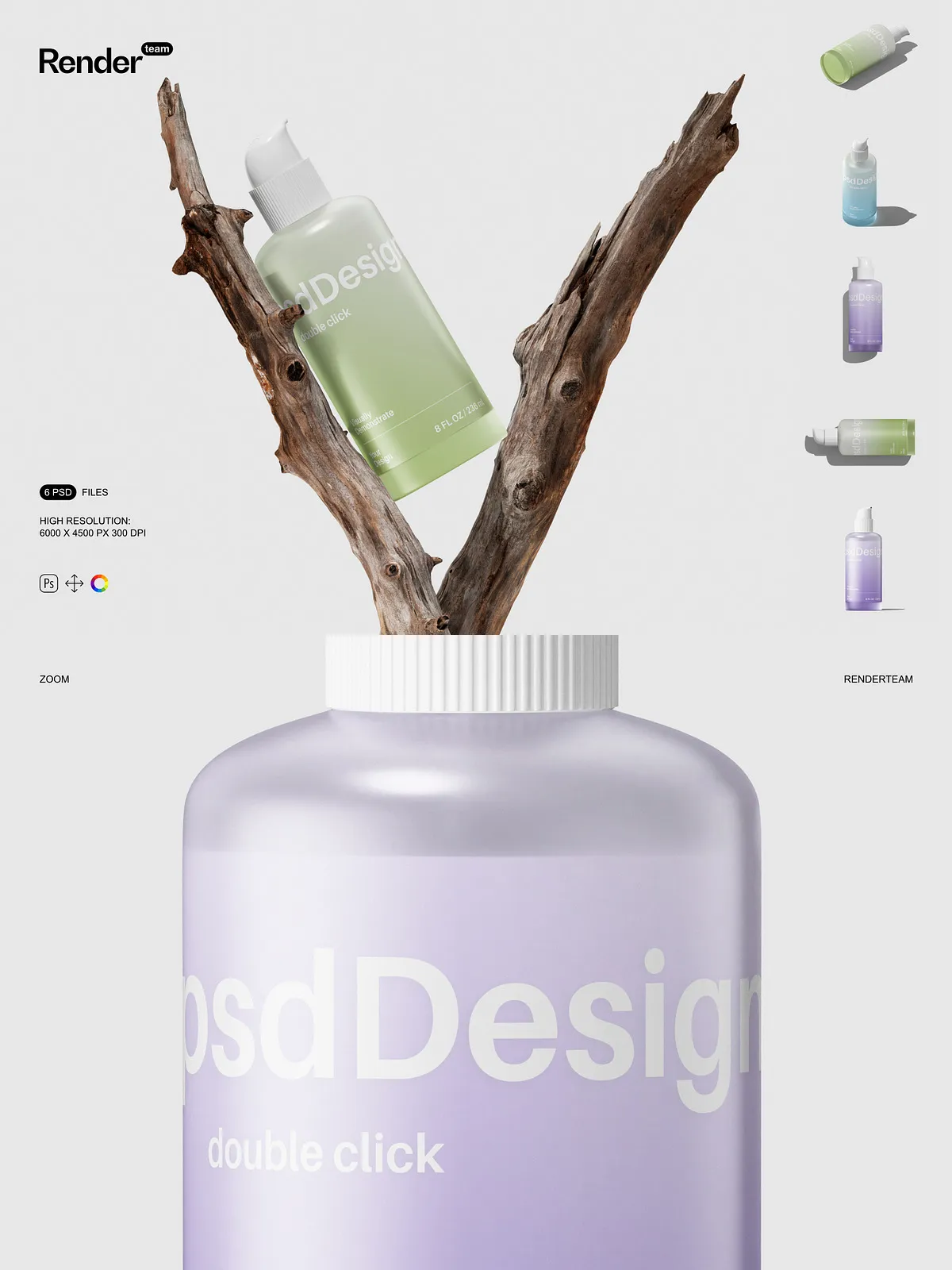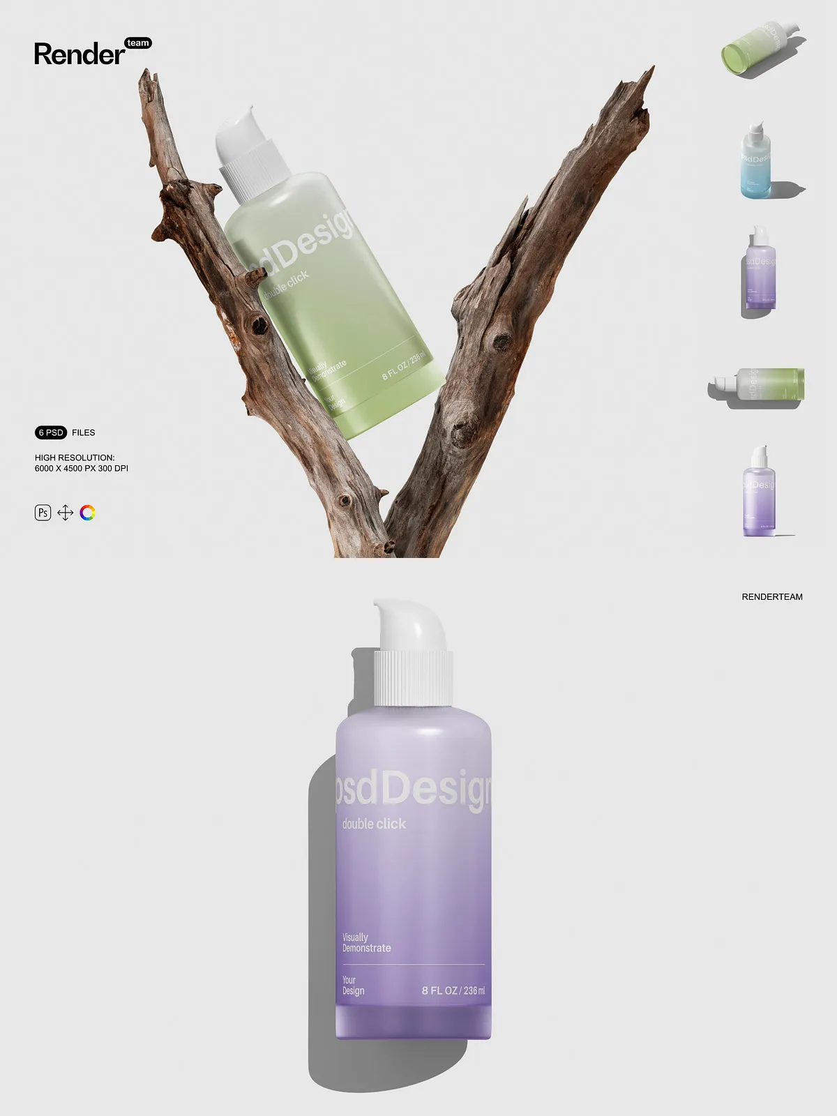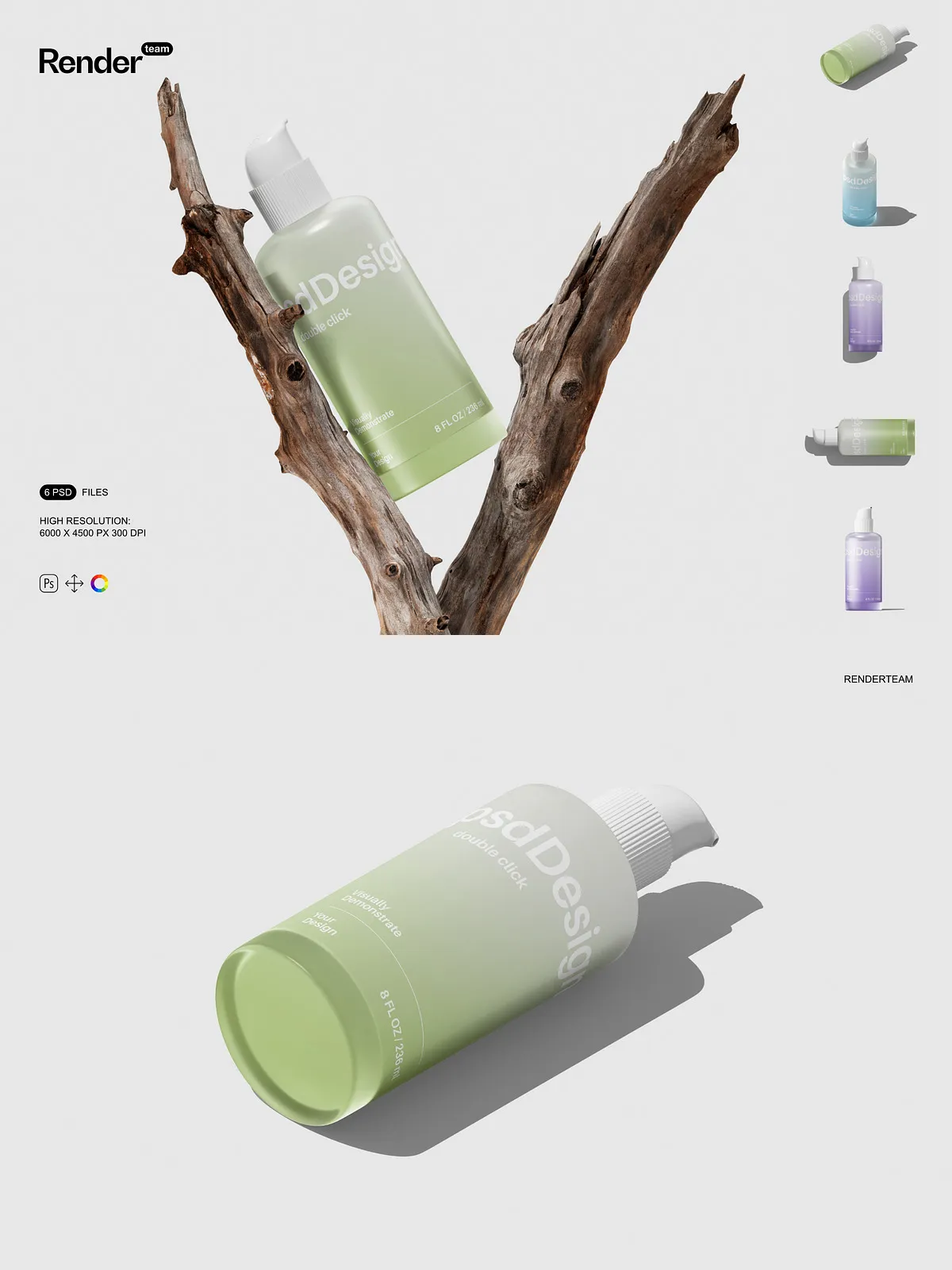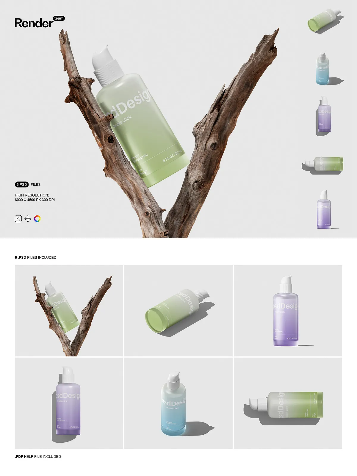 The Cosmetic Bottle Mockup Set delivers five meticulously crafted, fully layered PSD files designed to showcase your cosmetic bottle and packaging designs with realism and polish. Each mockup uses Smart Objects and organized color layers so you can apply your label artwork and color schemes quickly and non-destructively. The files come at high resolution (6000 × 4500 px, 300 dpi) to preserve texture detail and typography clarity for both web previews and print-ready proofs. Whether you prepare product presentation images for client reviews, online stores, or portfolio displays, this set helps you produce consistent, high-quality visuals that emphasize material, finish, and scale.