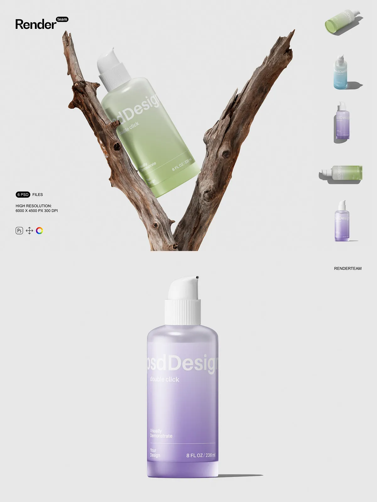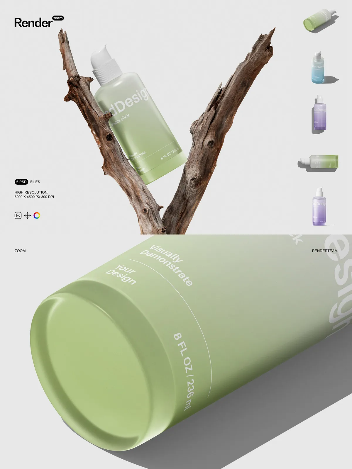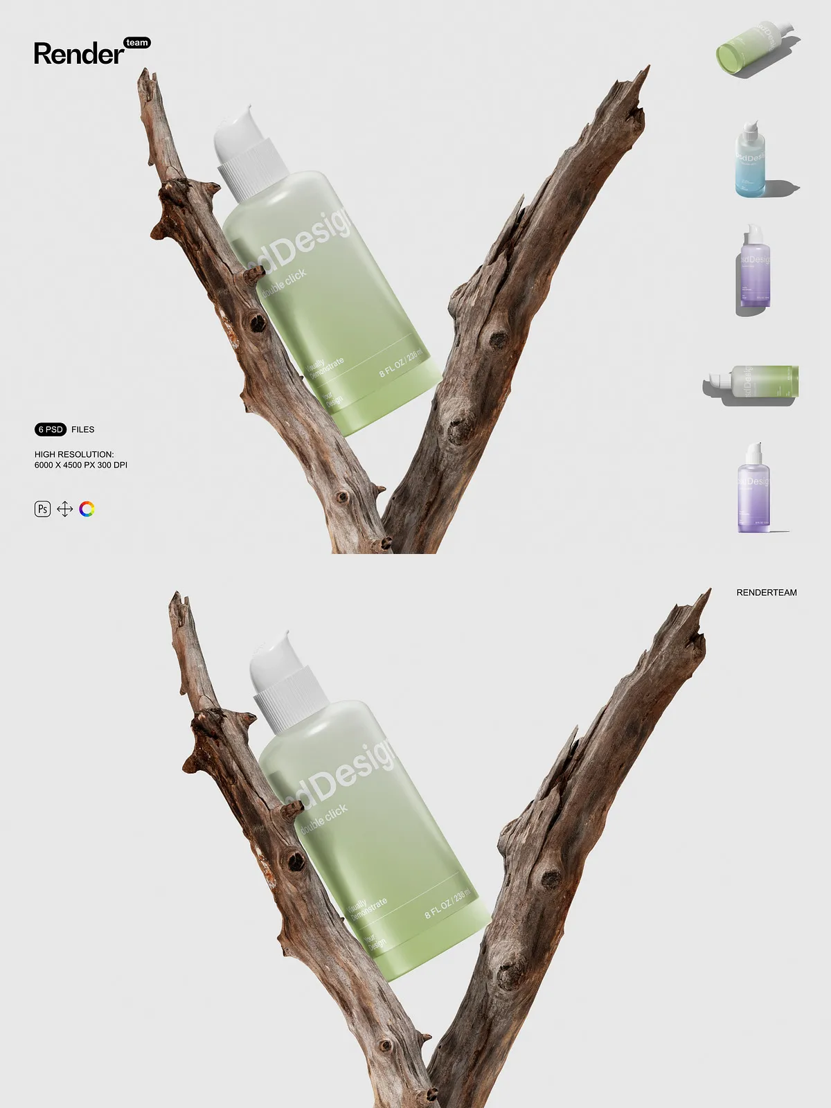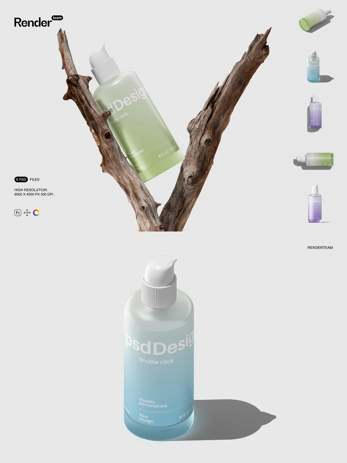 The Cosmetic Bottle Mockup Set delivers five meticulously crafted, fully layered PSD files designed to showcase your cosmetic bottle and packaging designs with realism and polish. Each mockup uses Smart Objects and organized color layers so you can apply your label artwork and color schemes quickly and non-destructively. The files come at high resolution (6000 × 4500 px, 300 dpi) to preserve texture detail and typography clarity for both web previews and print-ready proofs. Whether you prepare product presentation images for client reviews, online stores, or portfolio displays, this set helps you produce consistent, high-quality visuals that emphasize material, finish, and scale.