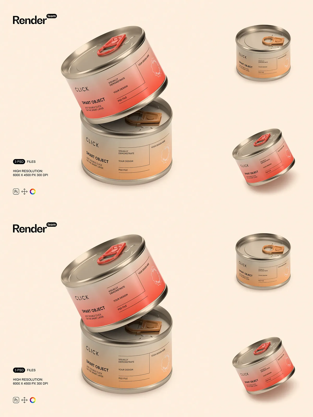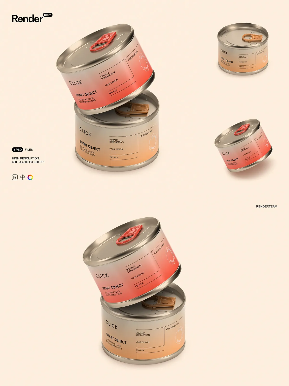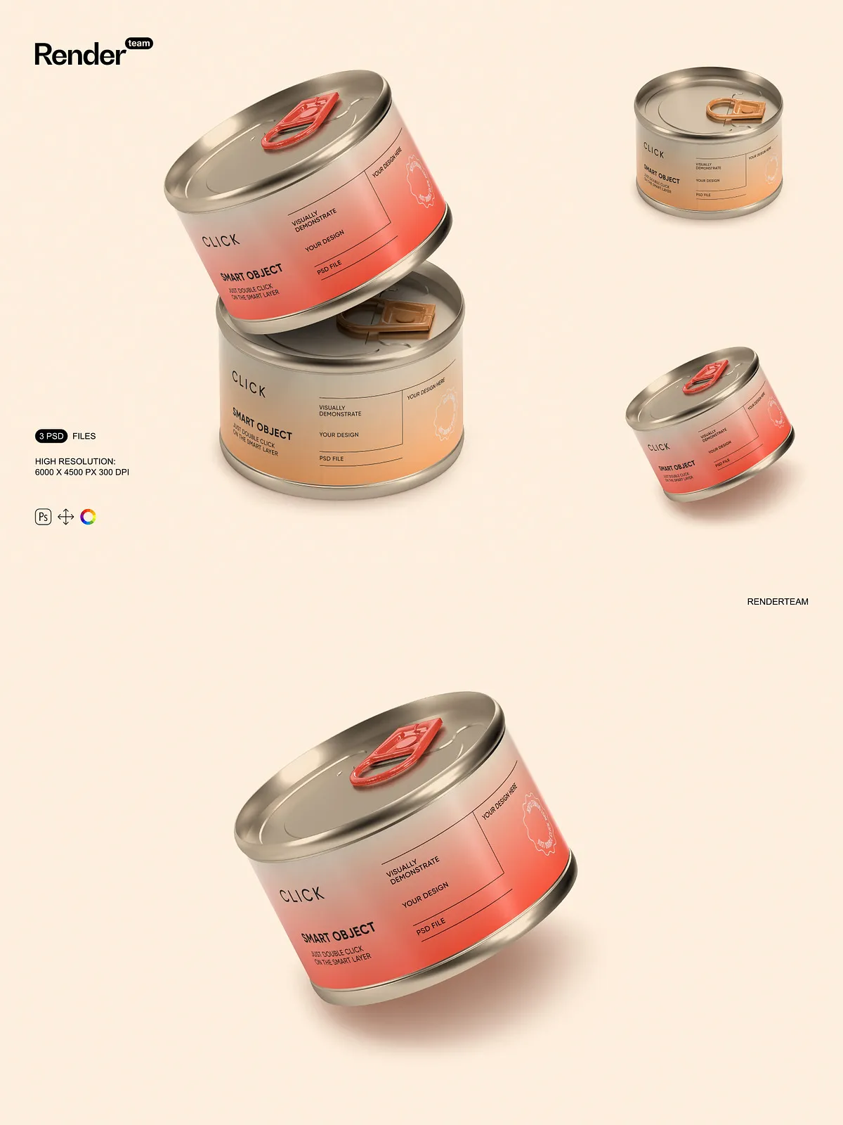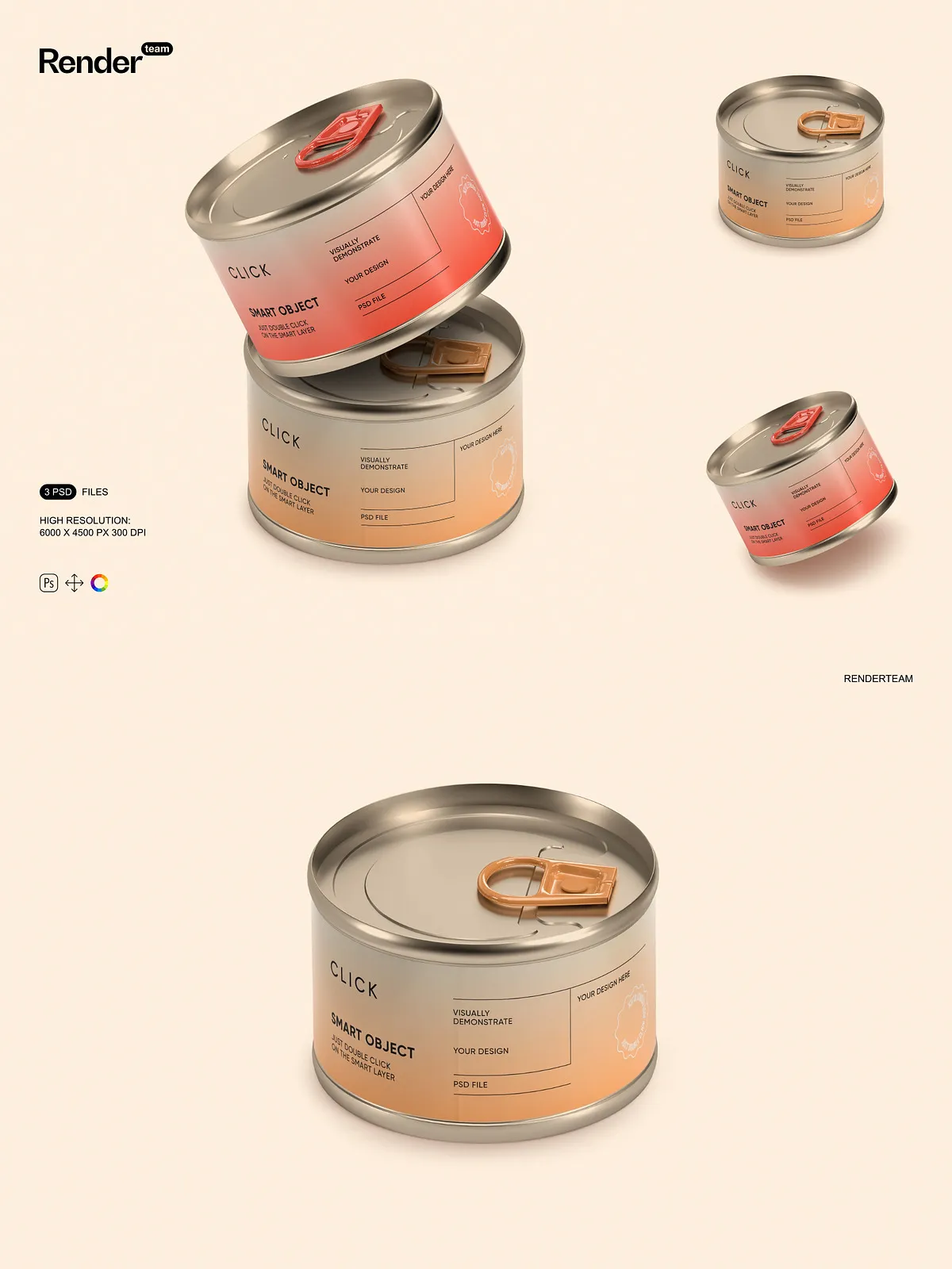• 3 high-resolution PSD mockups featuring different angles and presentation styles of food tin cans
