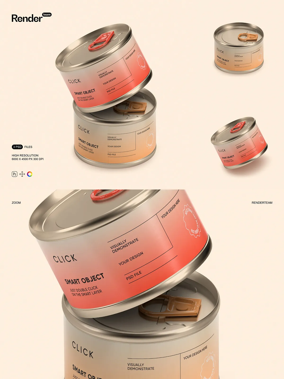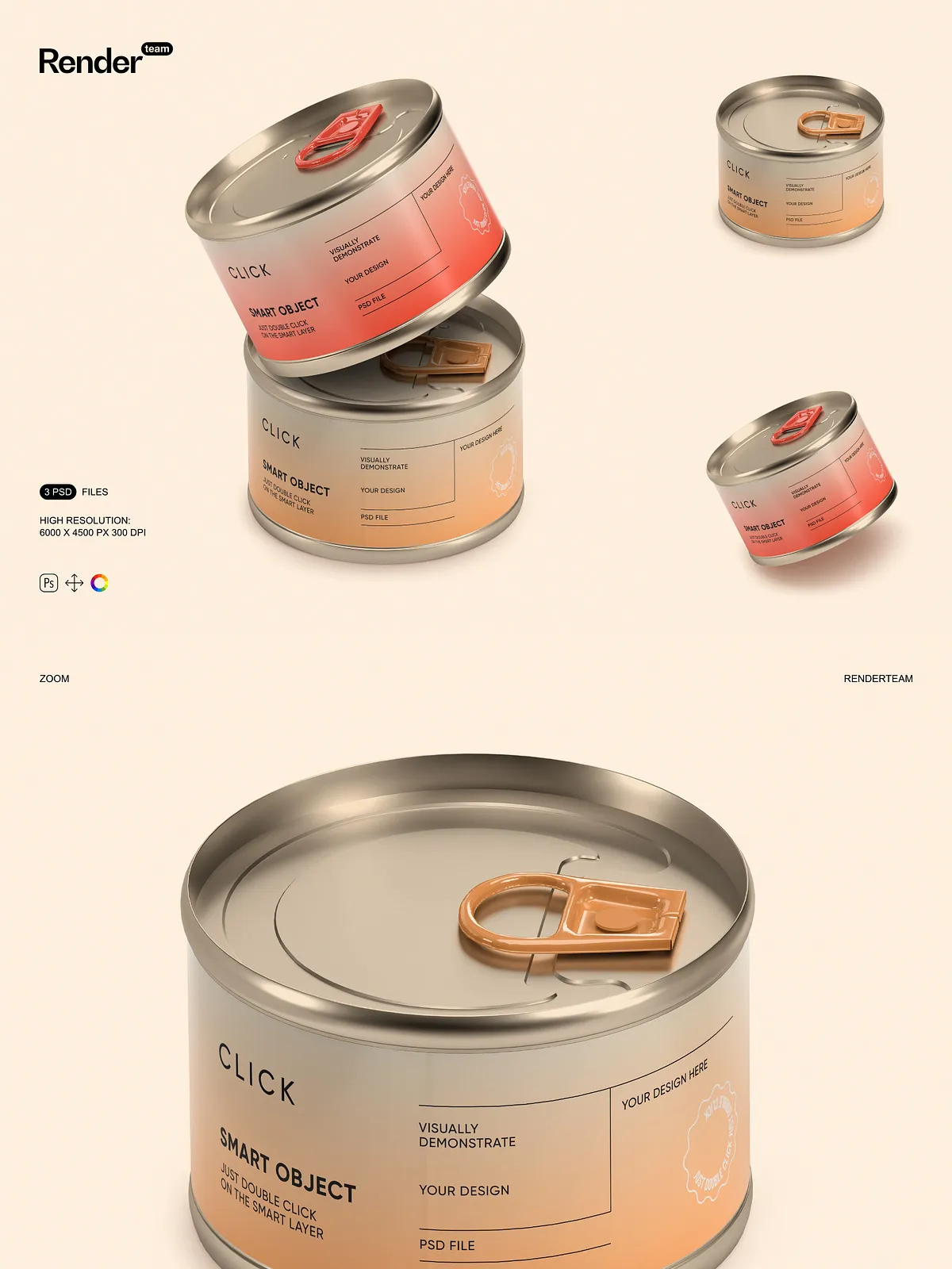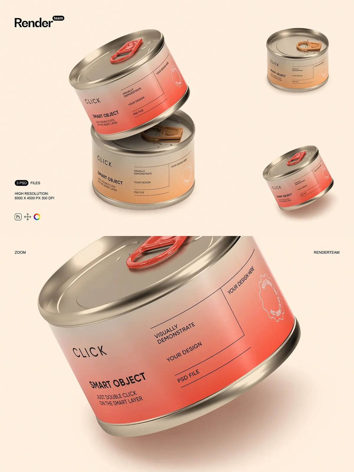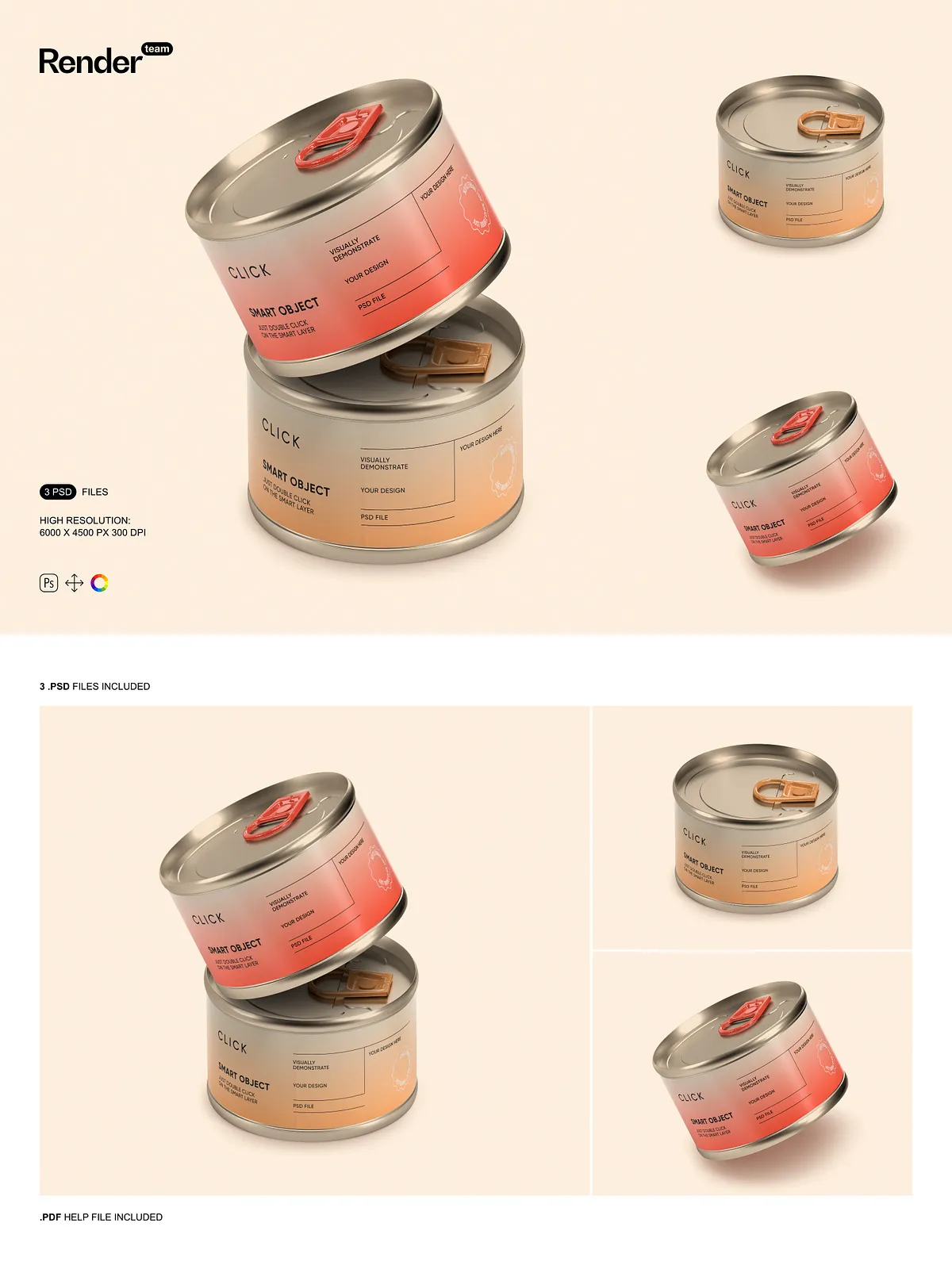 • 3 high-resolution PSD mockups featuring different angles and presentation styles of food tin cans