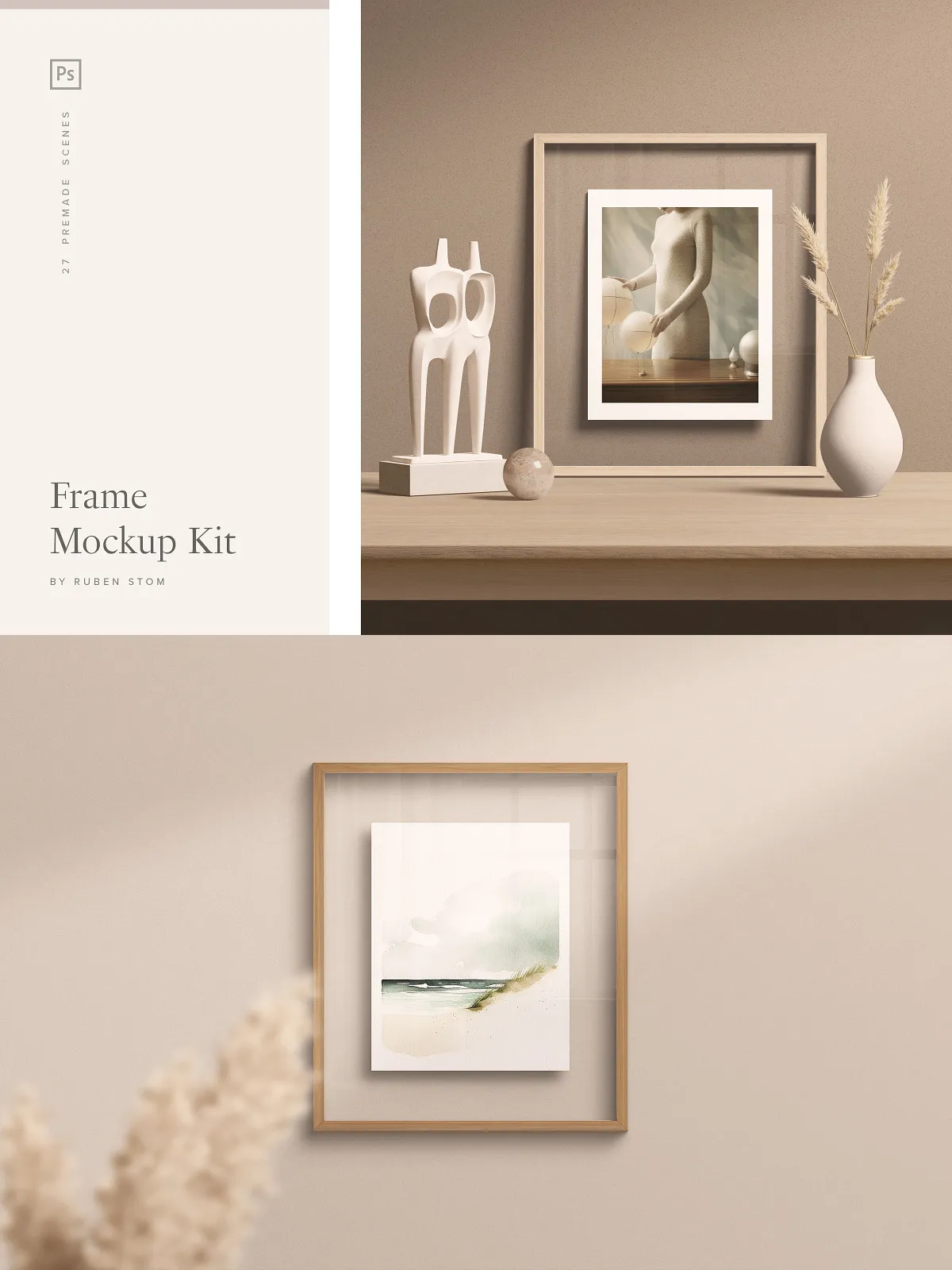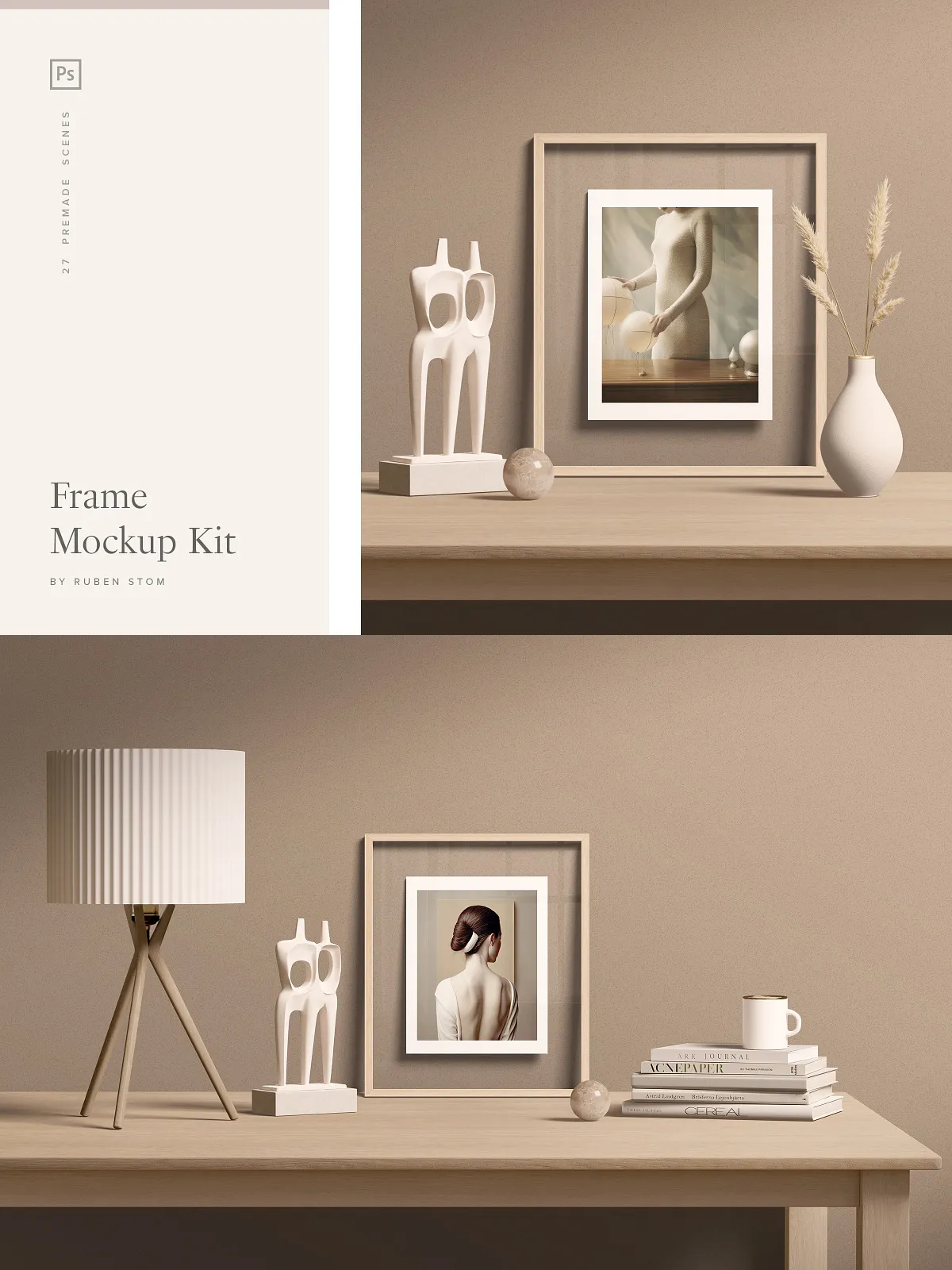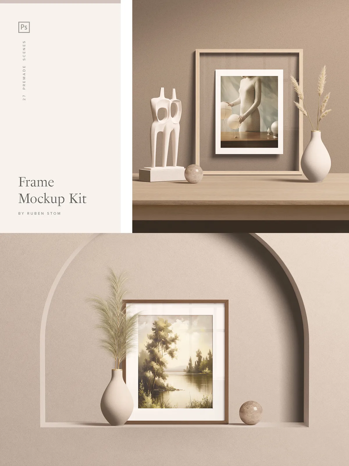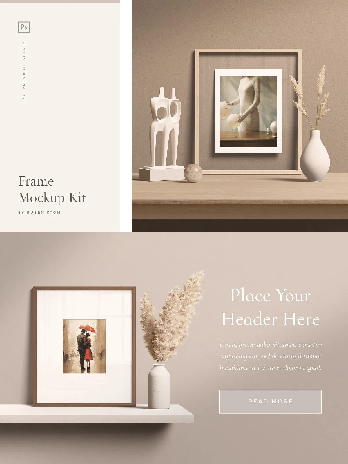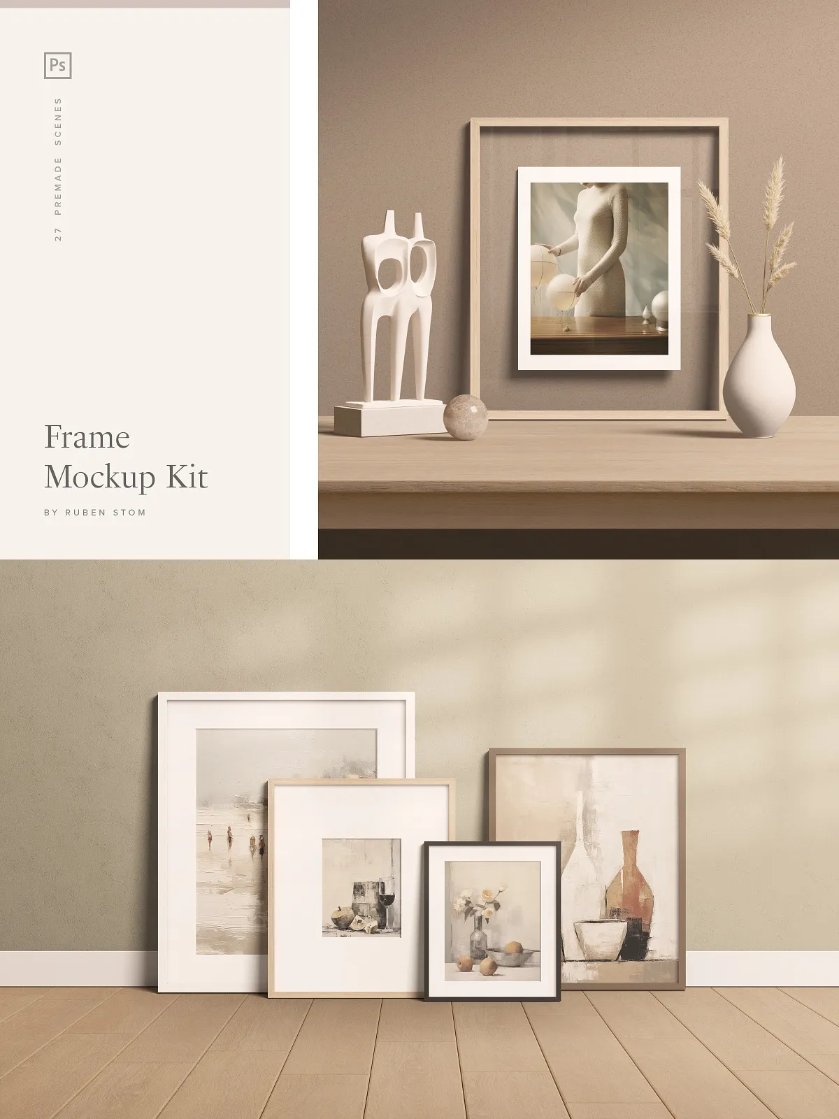 Deliver professional-grade results in seconds. The FRAME MOCKUP KIT includes 27 meticulously crafted scenes that simulate real-world display environments — from modern gallery walls and minimalist home interiors to cozy living room corners and studio backdrops. Each scene is fully layered and instantly customizable, letting you adjust lighting, shadows, textures, and framing with absolute precision.