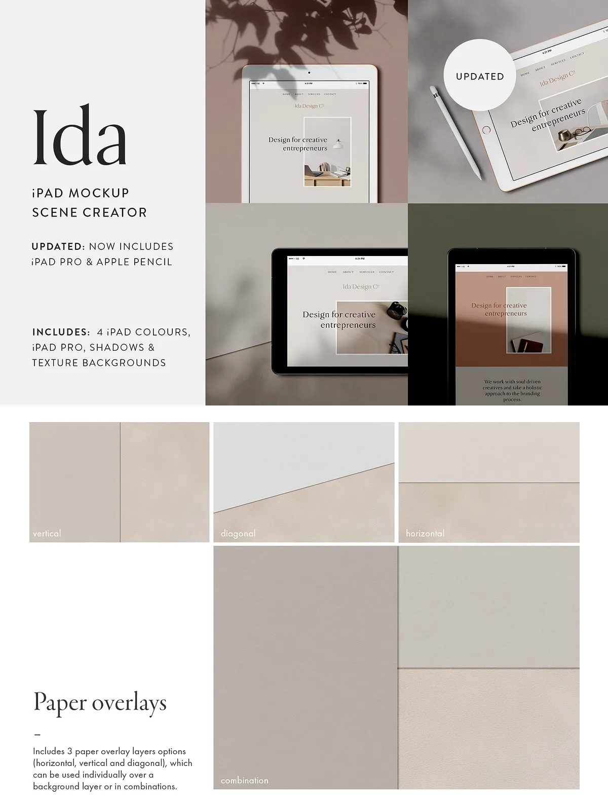 Transform your website mockup into a believable context. Instead of placing a flat rectangle on a plain background, Ida lets you build living scenes: place your iPad on a textured paper surface, adjust its shadow depth, and blend overlay patterns to suggest mood, light direction, and surface material.