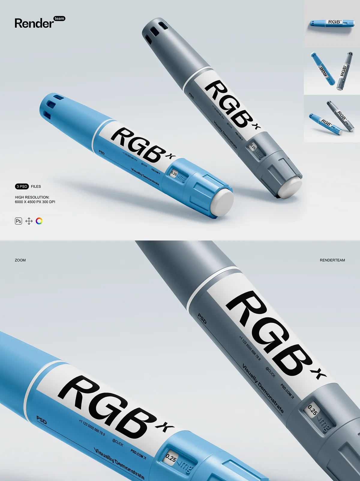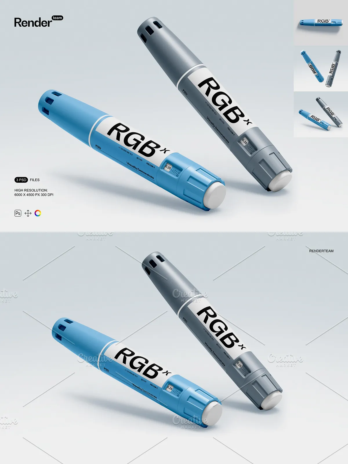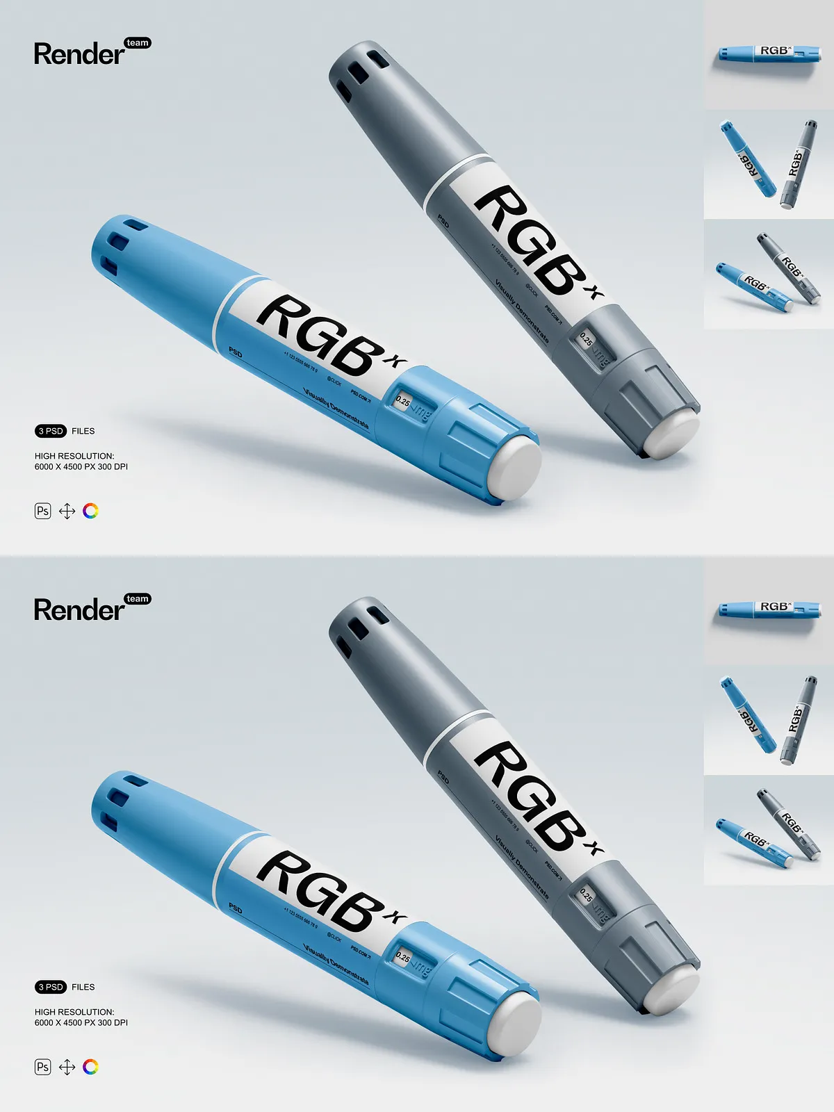 • 3 meticulously crafted PSD templates featuring insulin pens in diverse environments: clinical consultation rooms, home medication stations, and medical supply counters
