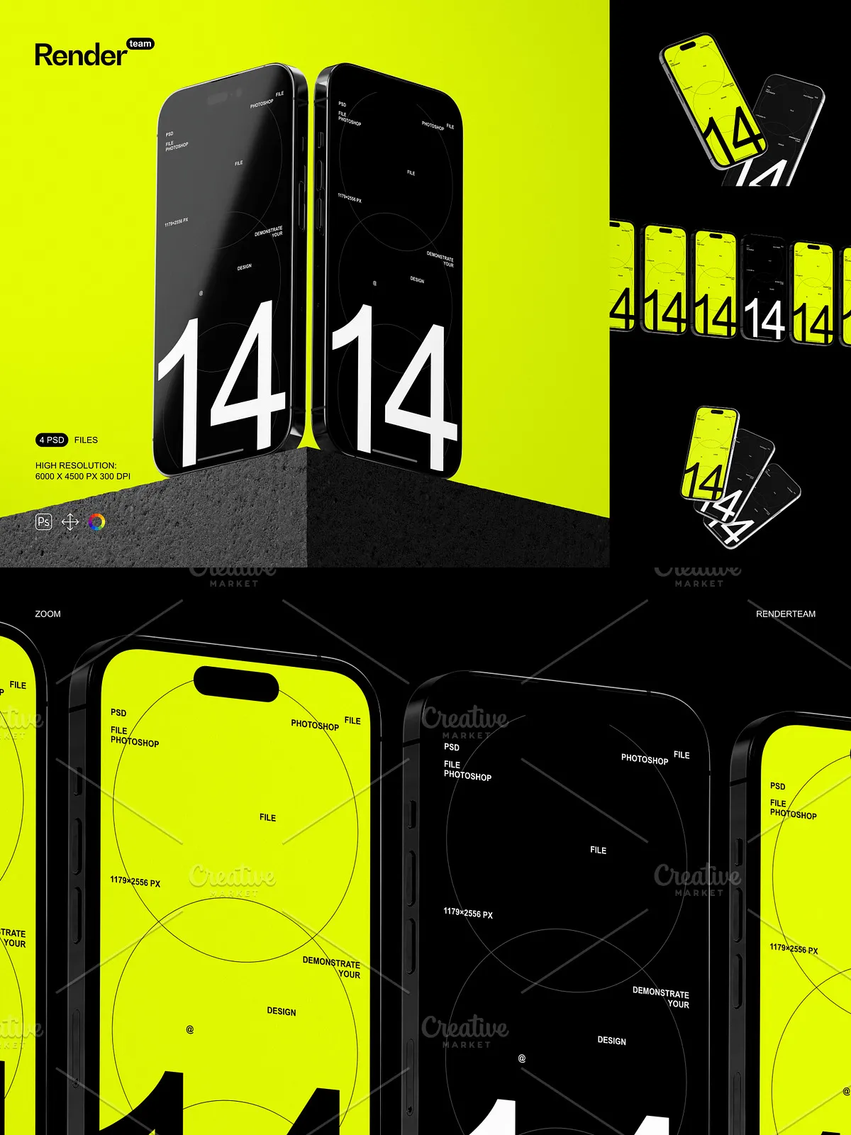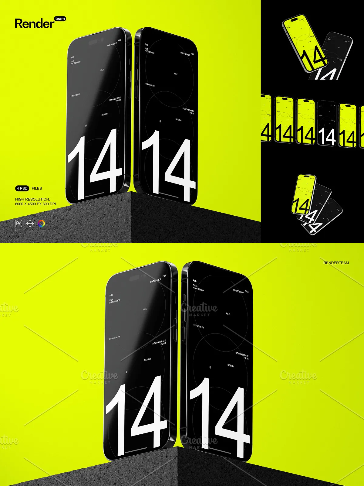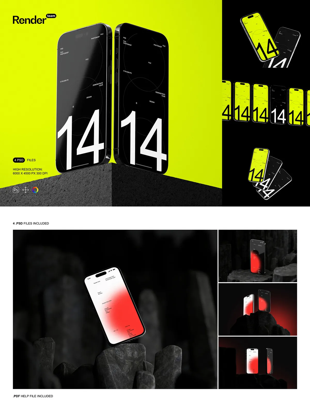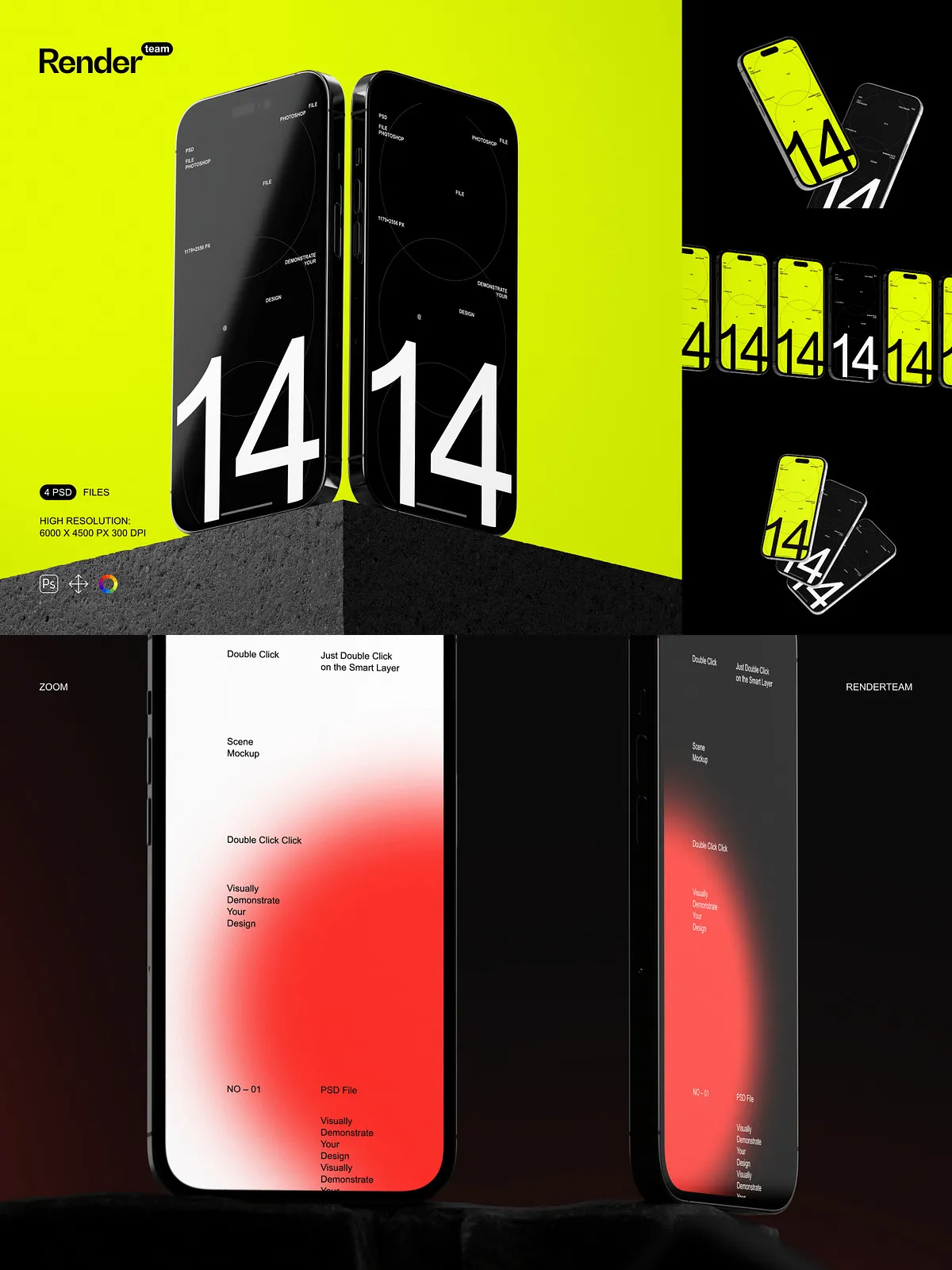 - 4 distinct, layered PSD mockup templates: Portrait Mode in Hand, Landscape on Desk, Side View in Use, and Back-Camera Focus at a Glance