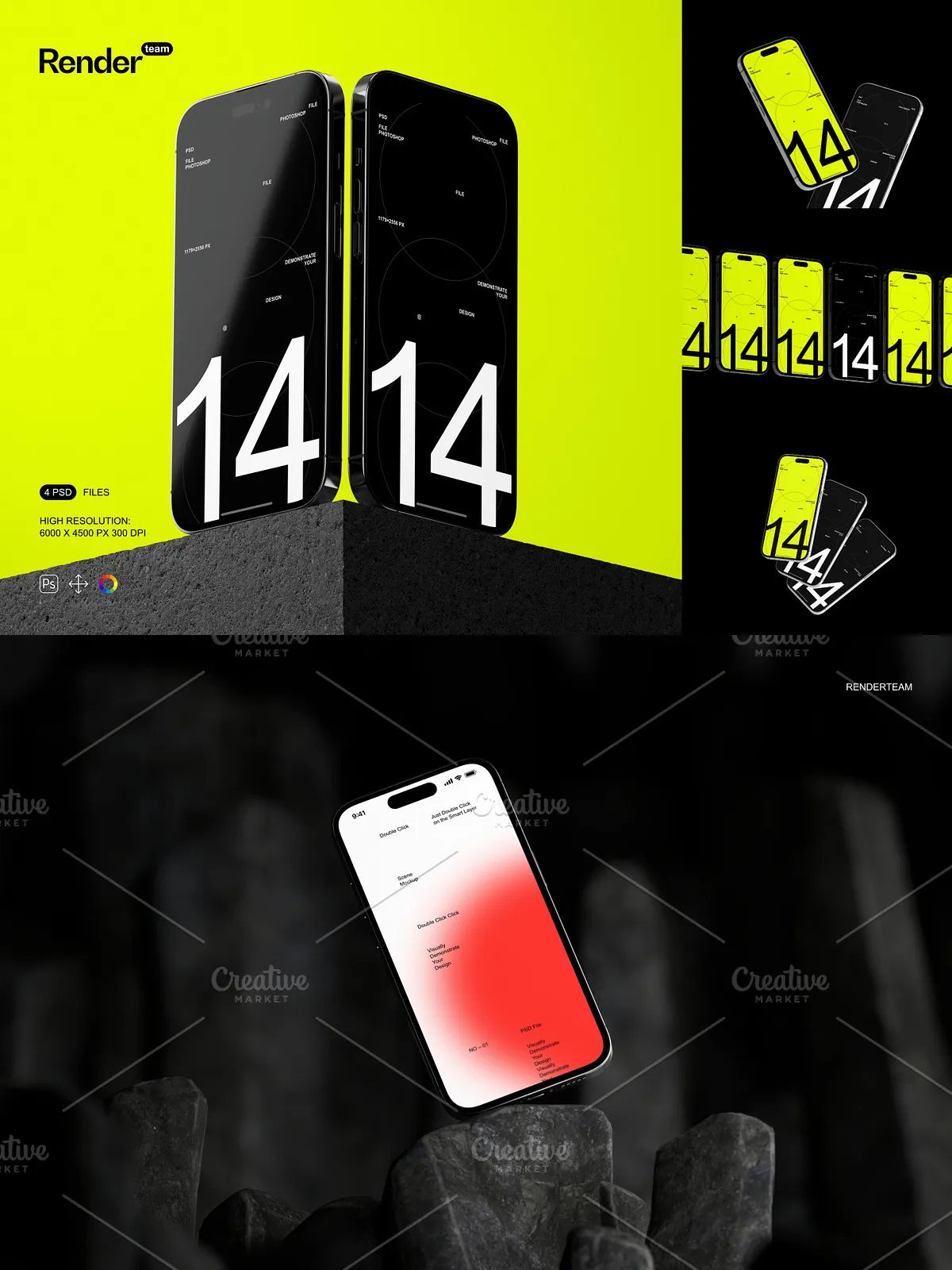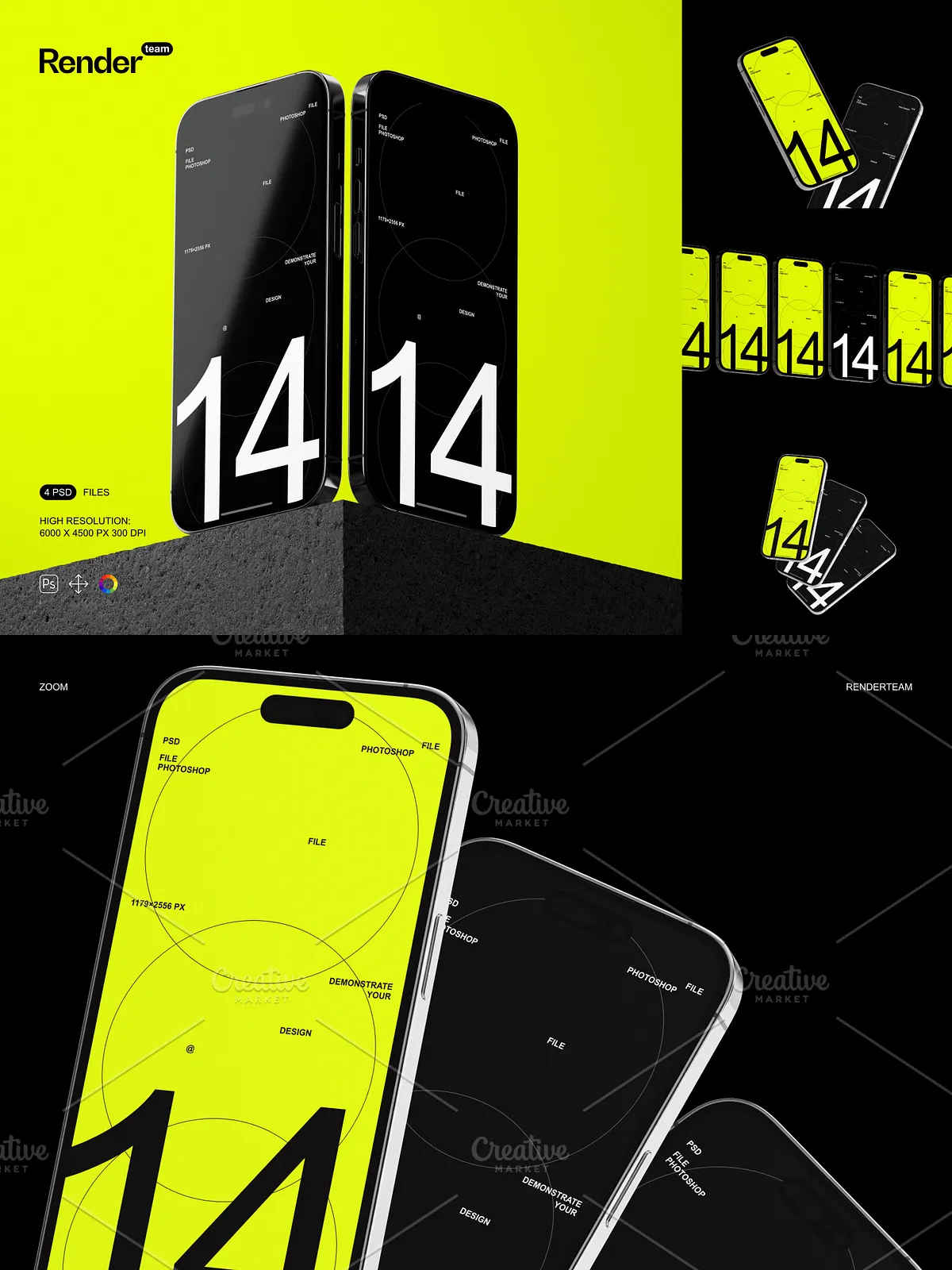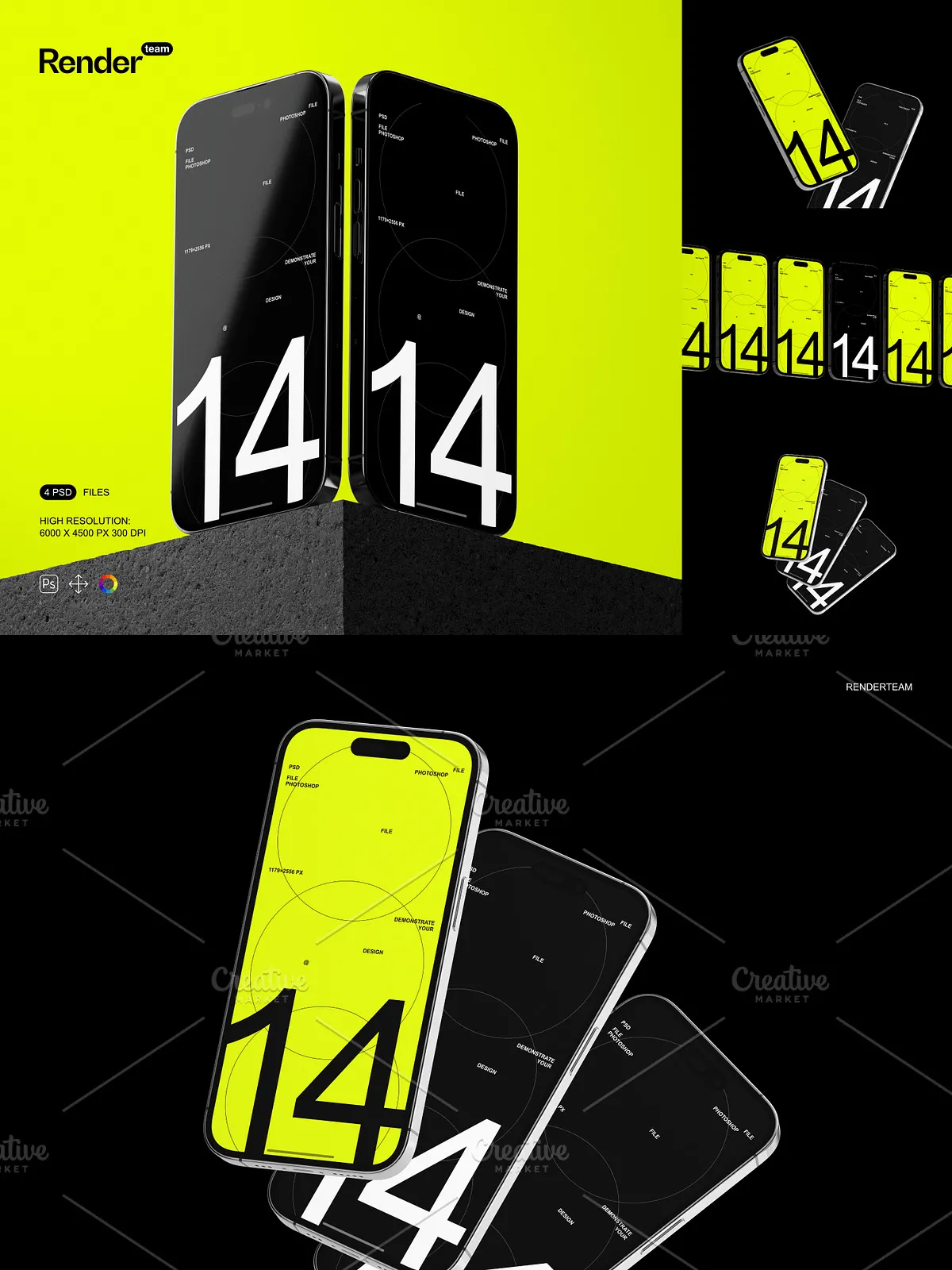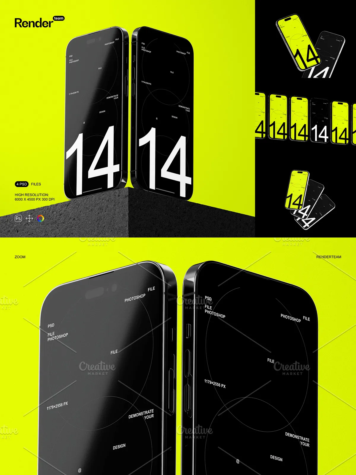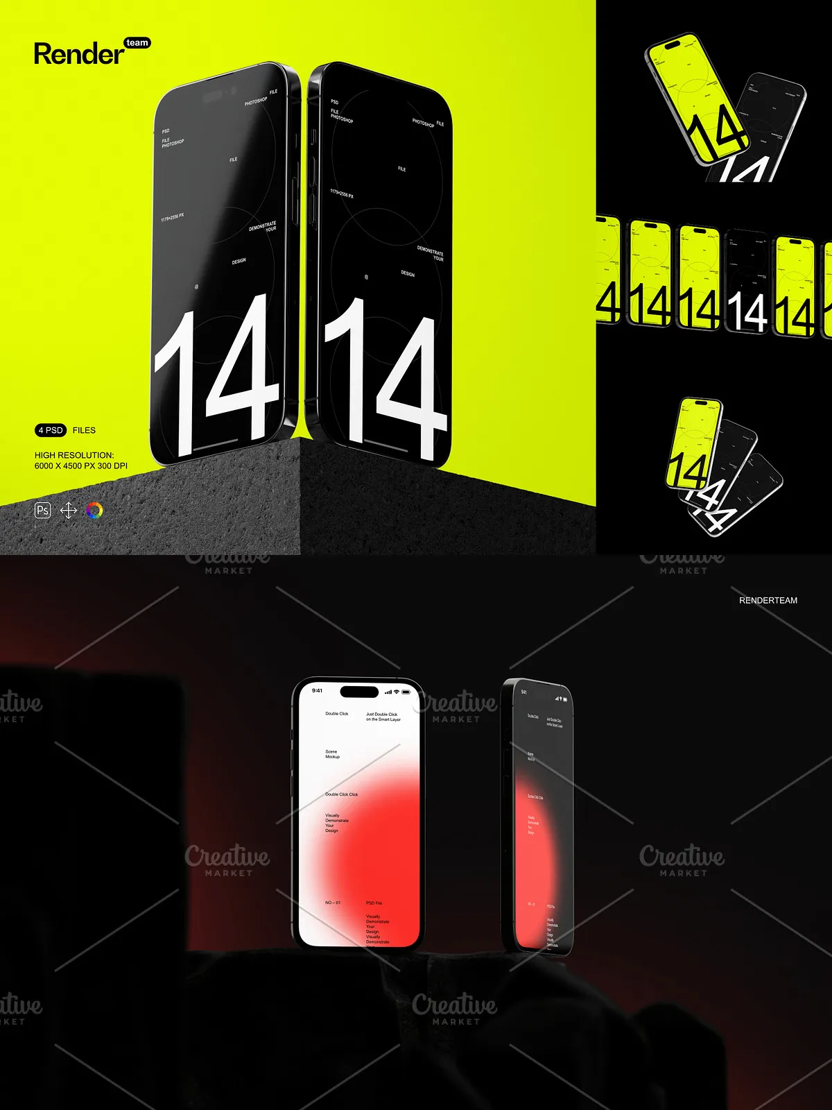 - 4 distinct, layered PSD mockup templates: Portrait Mode in Hand, Landscape on Desk, Side View in Use, and Back-Camera Focus at a Glance