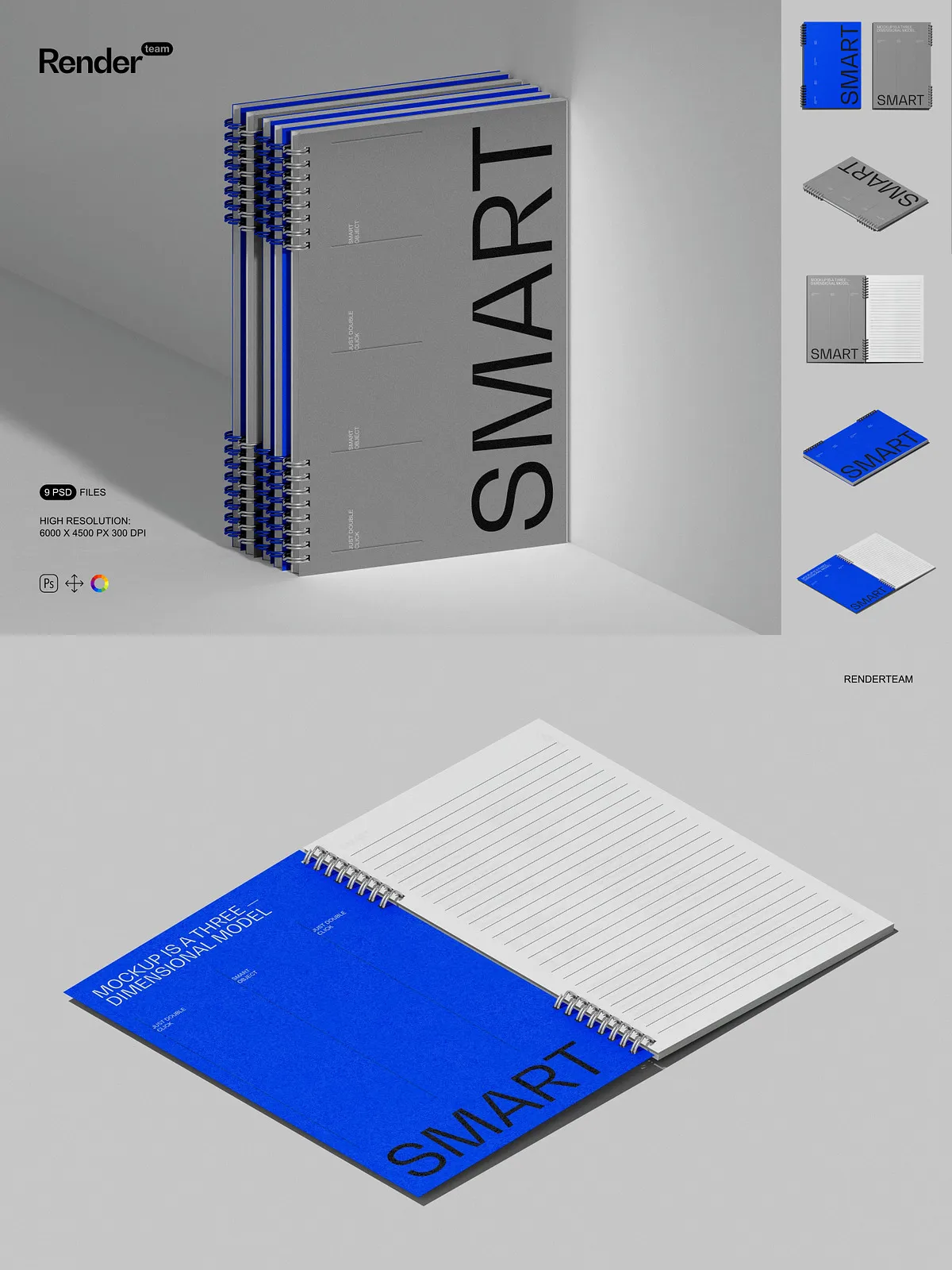 - 9 fully editable, high-resolution PSD files with diverse notebook styles: hardcover notebook, spiral-bound journal, loose-leaf planner, sketchbook with open pages, decorative cover design, desk scene placement, standing presentation view, minimalist layout, and digital art showcase