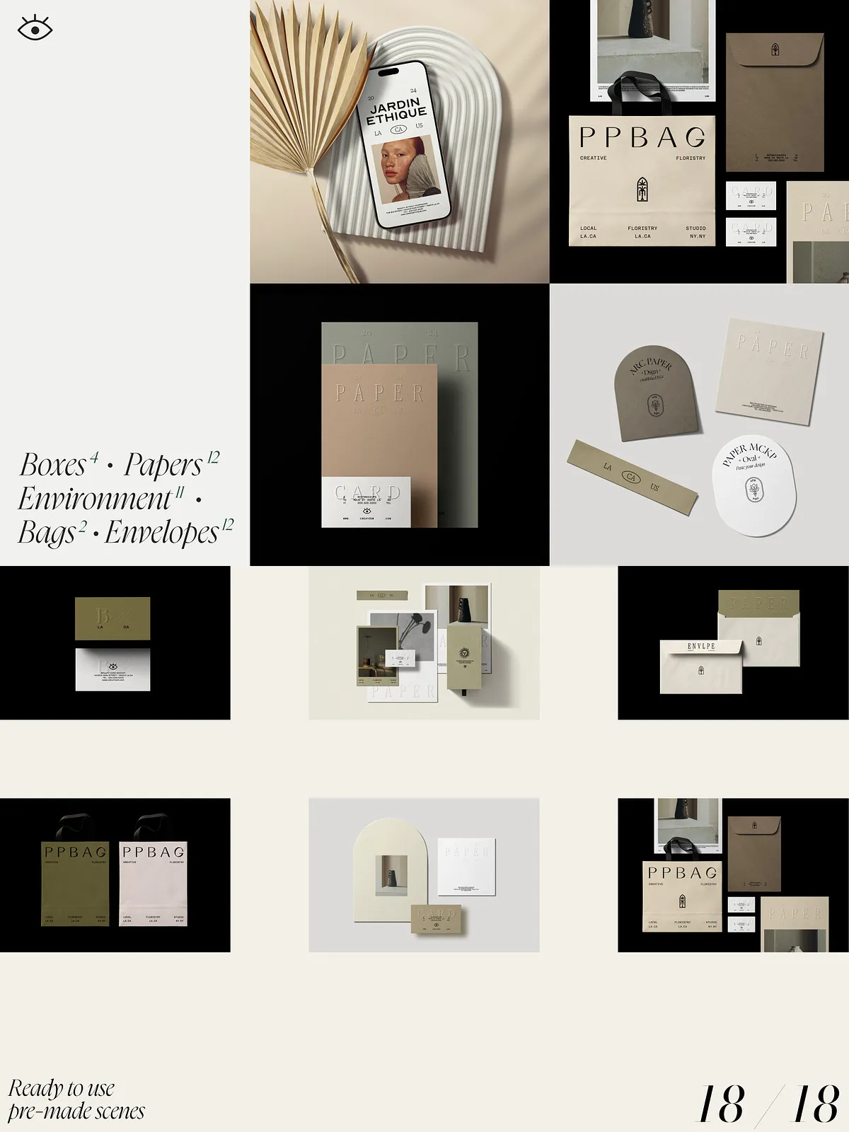 - 18 Premade Scene Mockups (18 PSD files) – from desk setups and hand-held shots to lifestyle scenes in cafes and home offices.