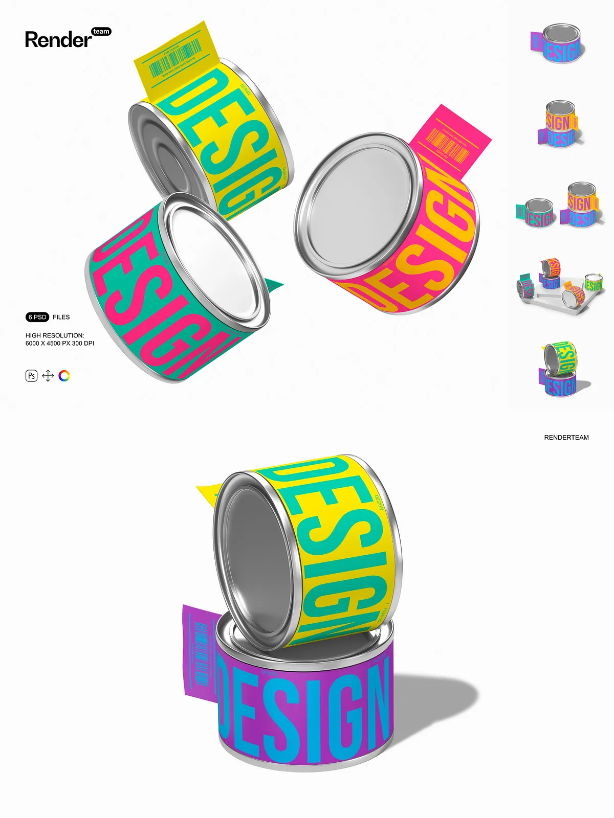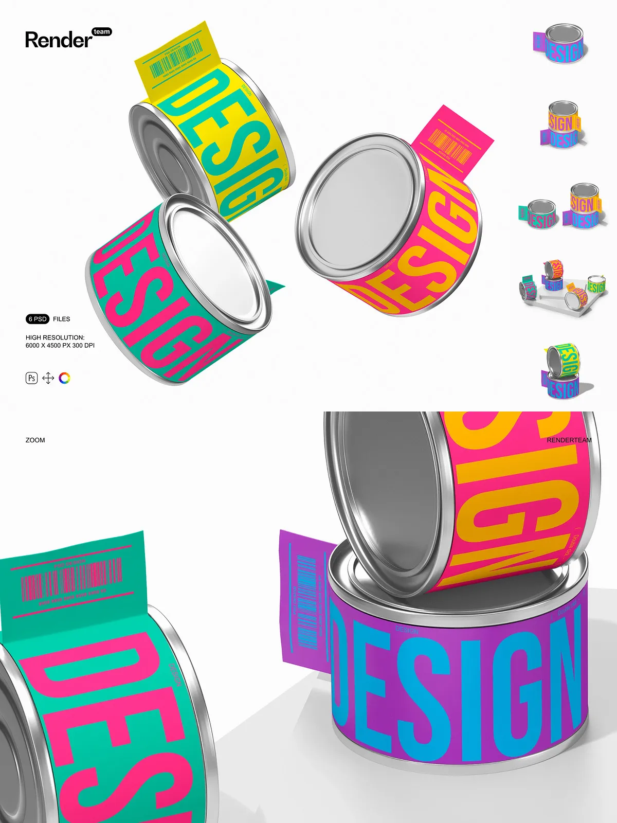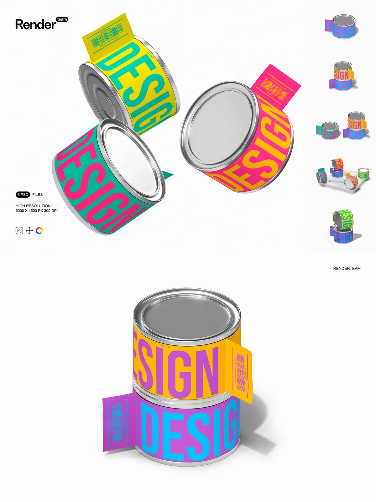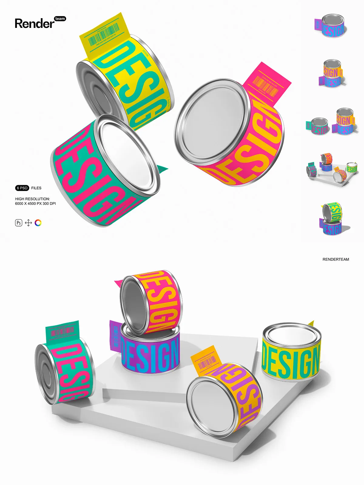 - 6 layered PSD mockup files featuring different paint can styles and display angles