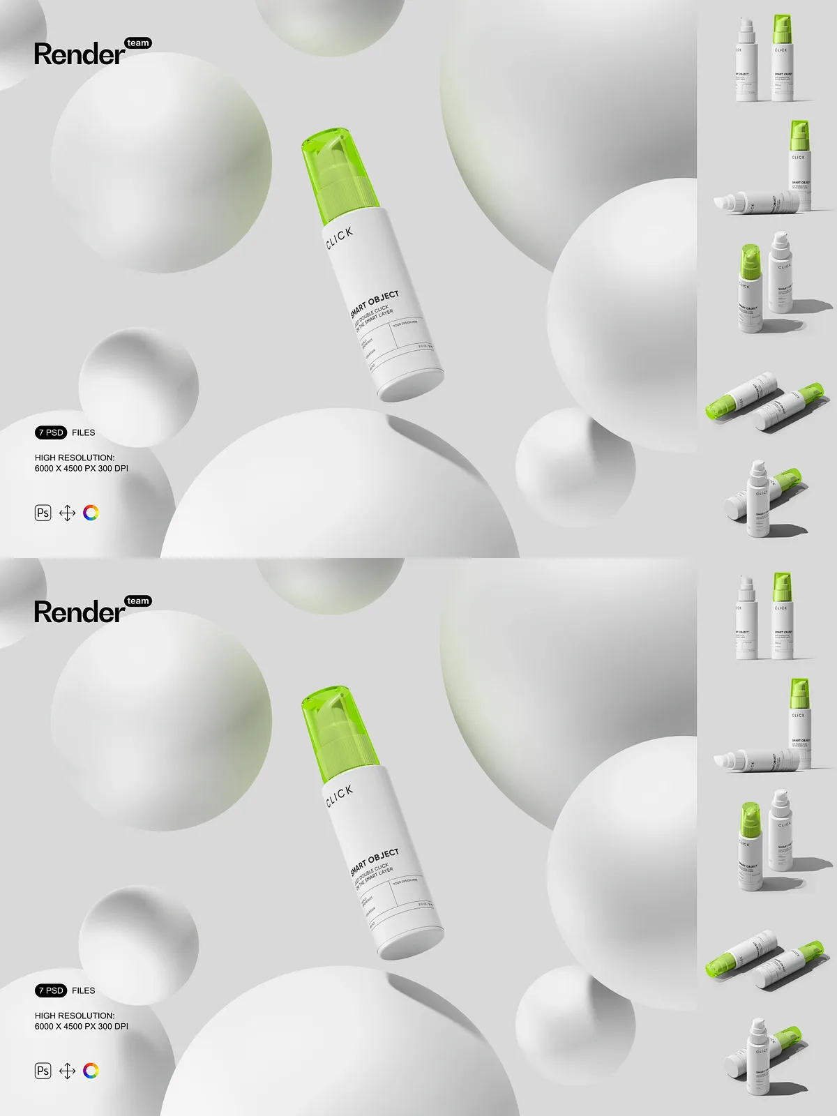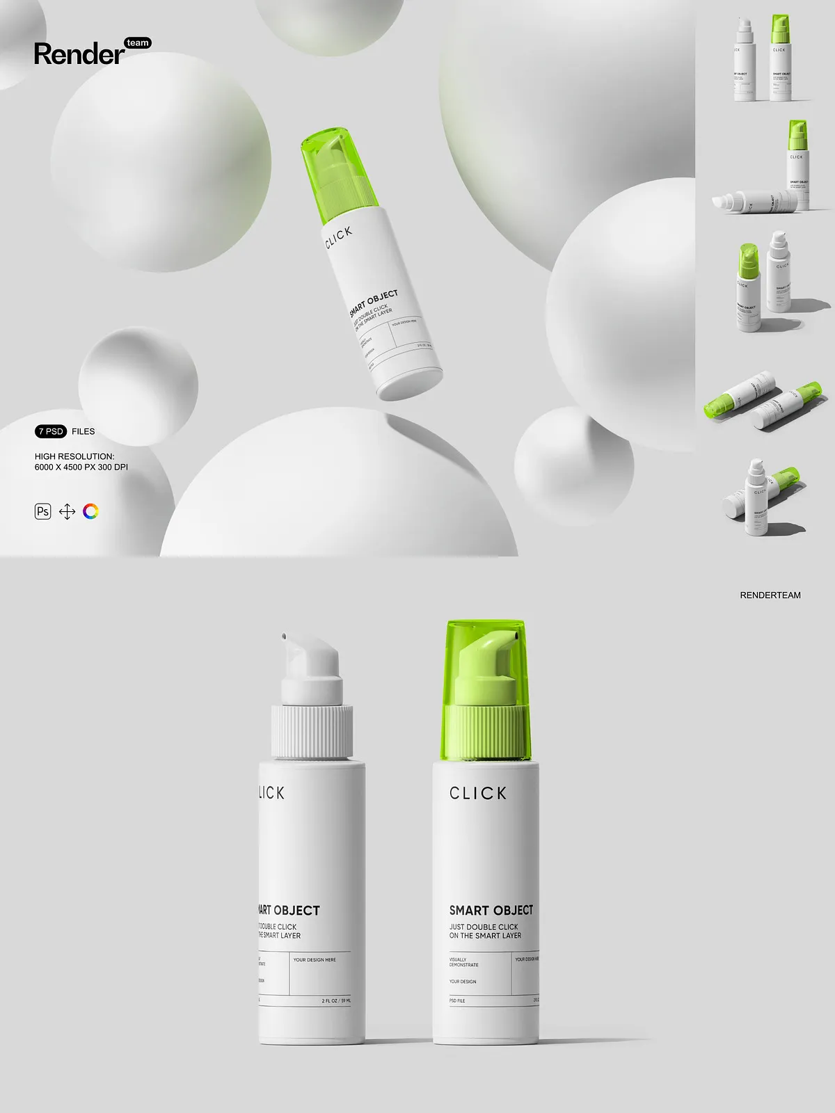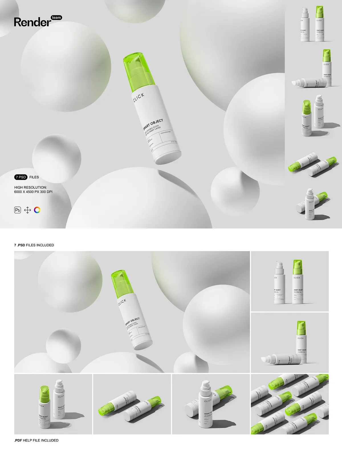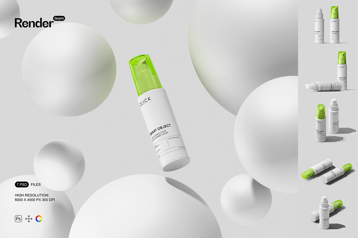 - 7 layered PSD mockup files showing multiple pump bottle angles and presentation styles