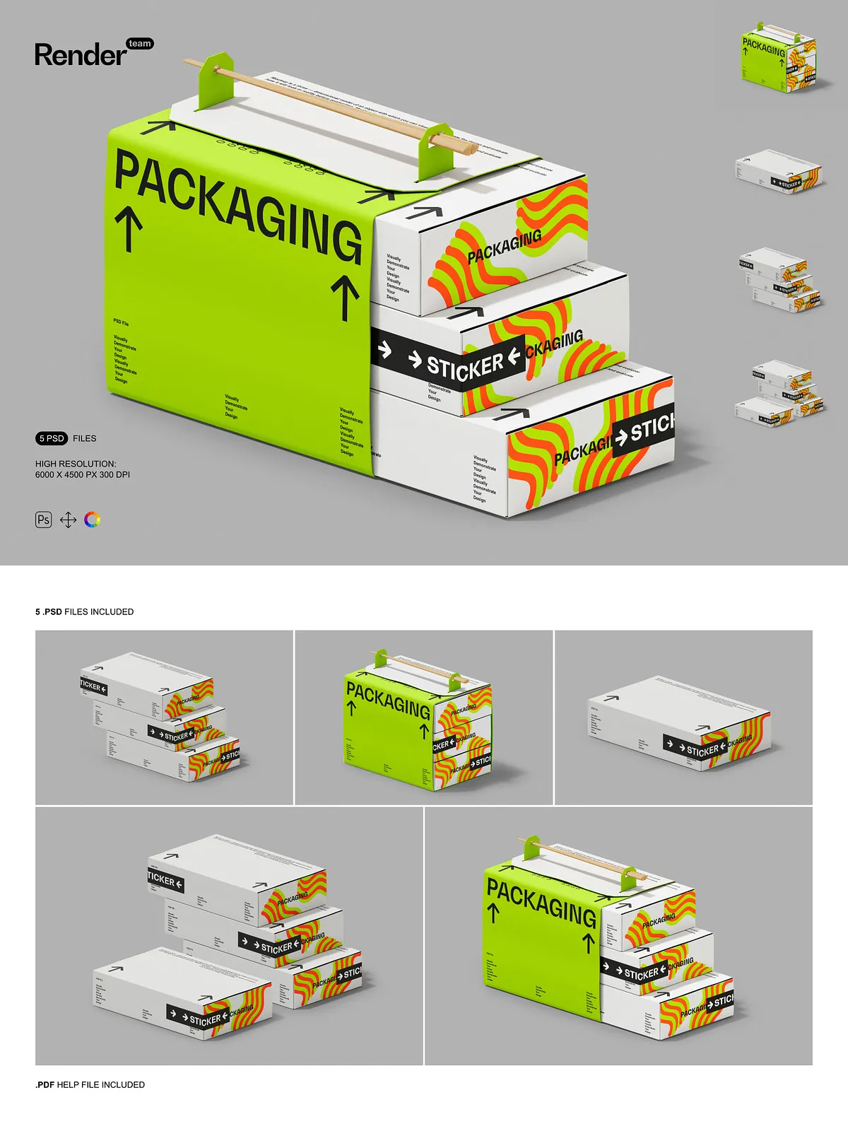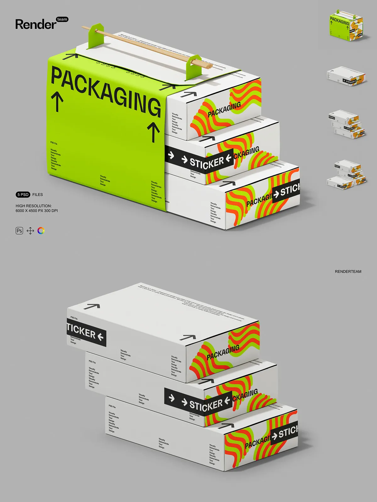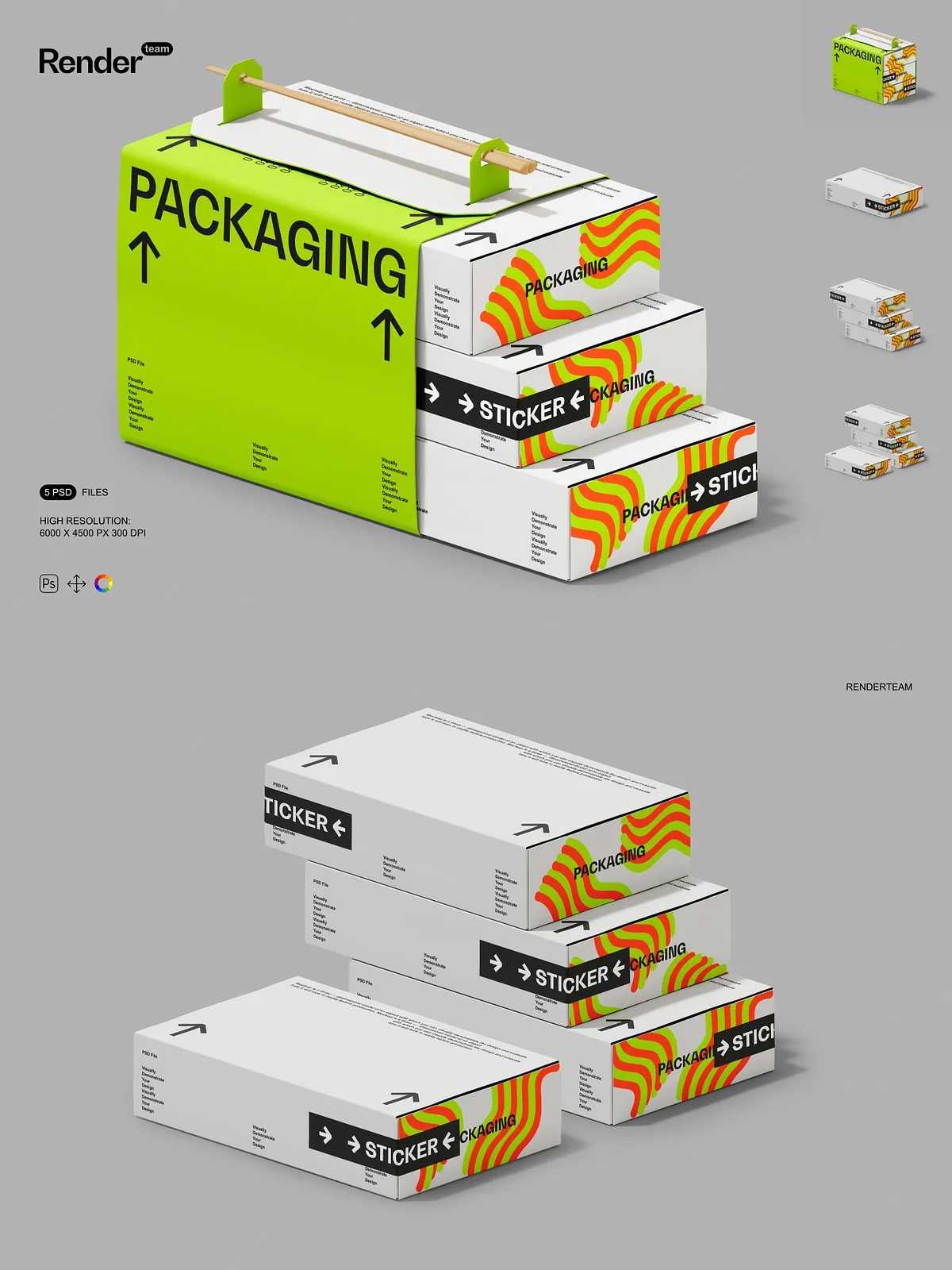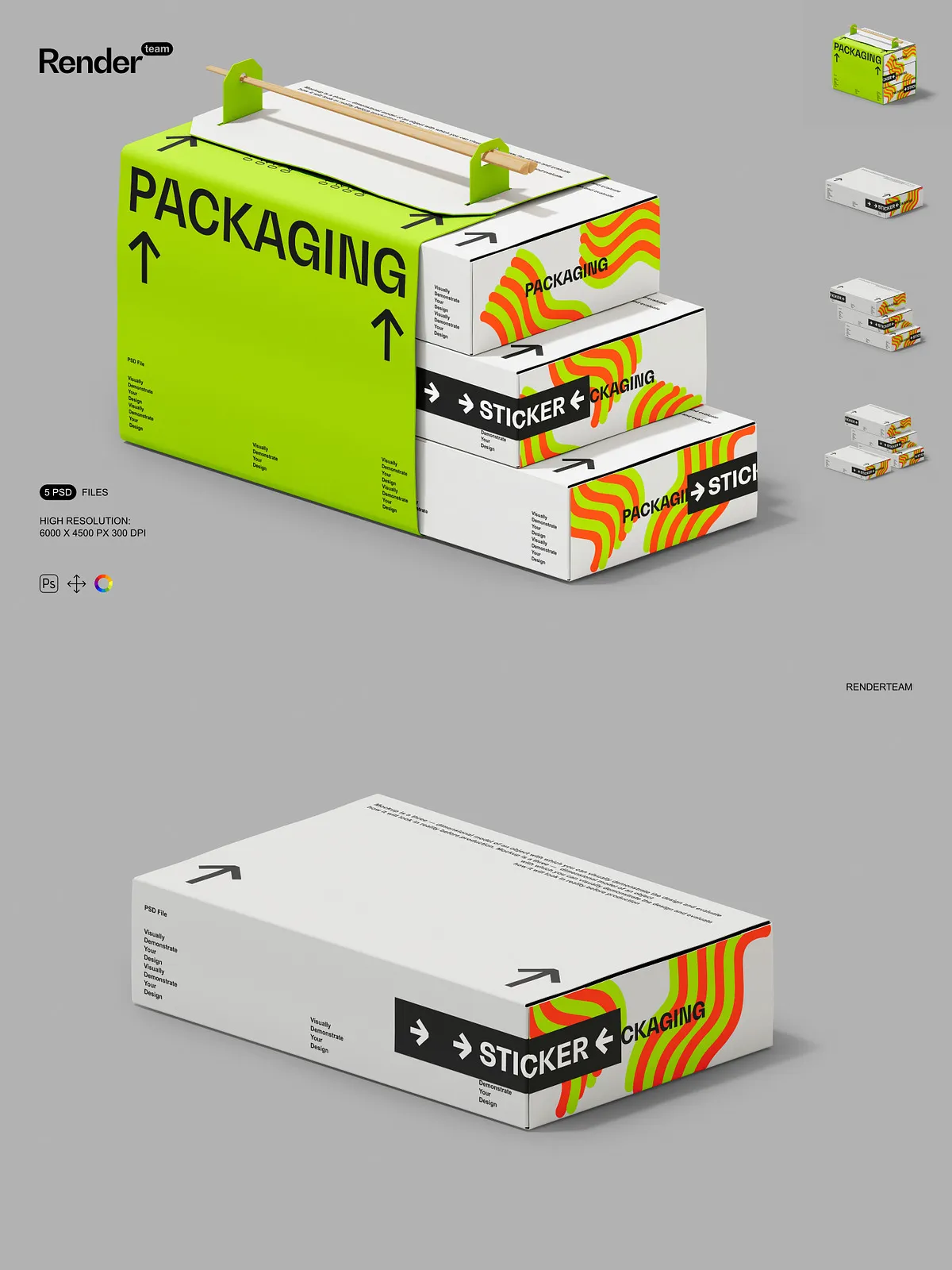 • 5 layered PSD mockup files showing multiple box orientations and presentation styles
