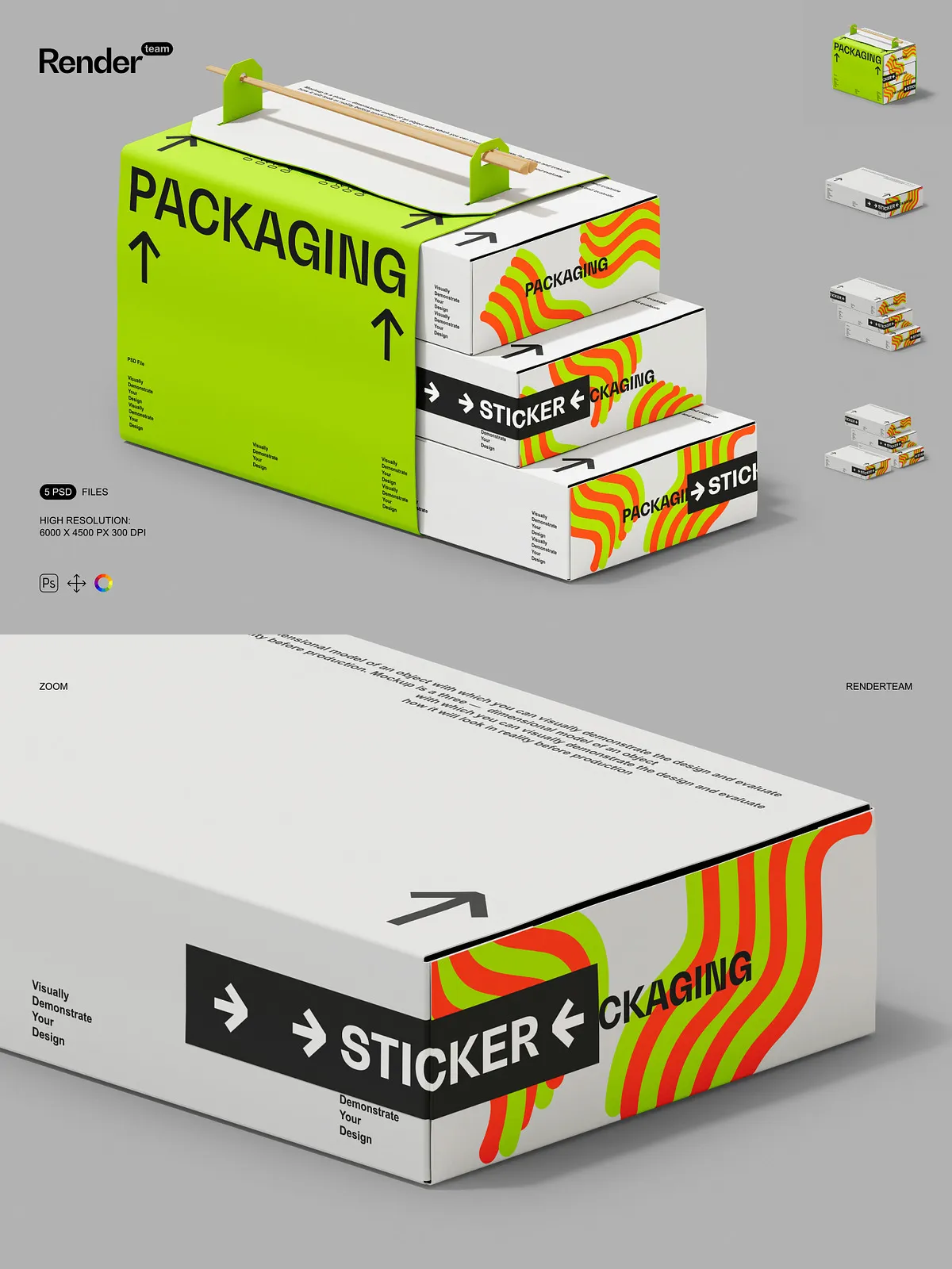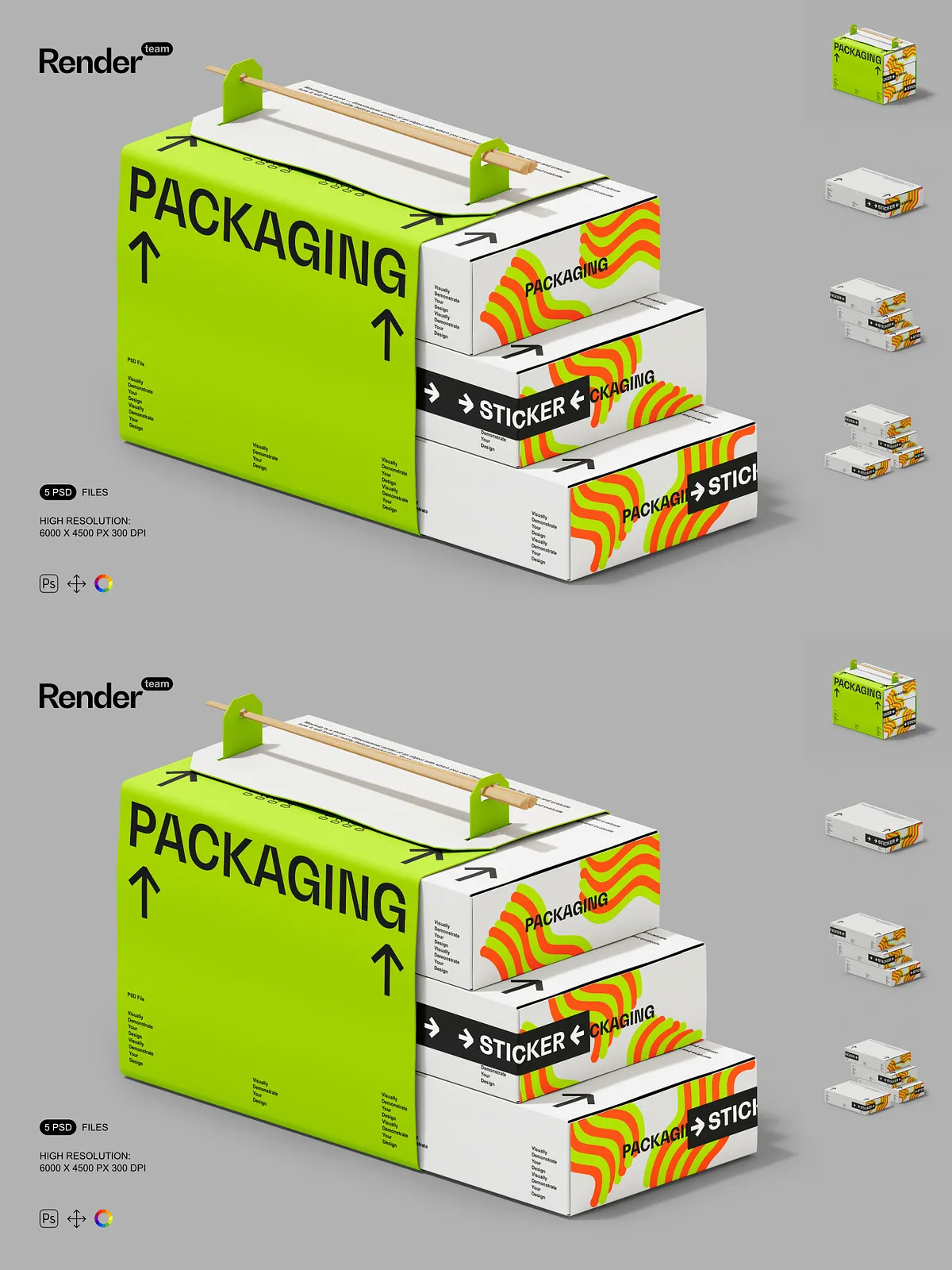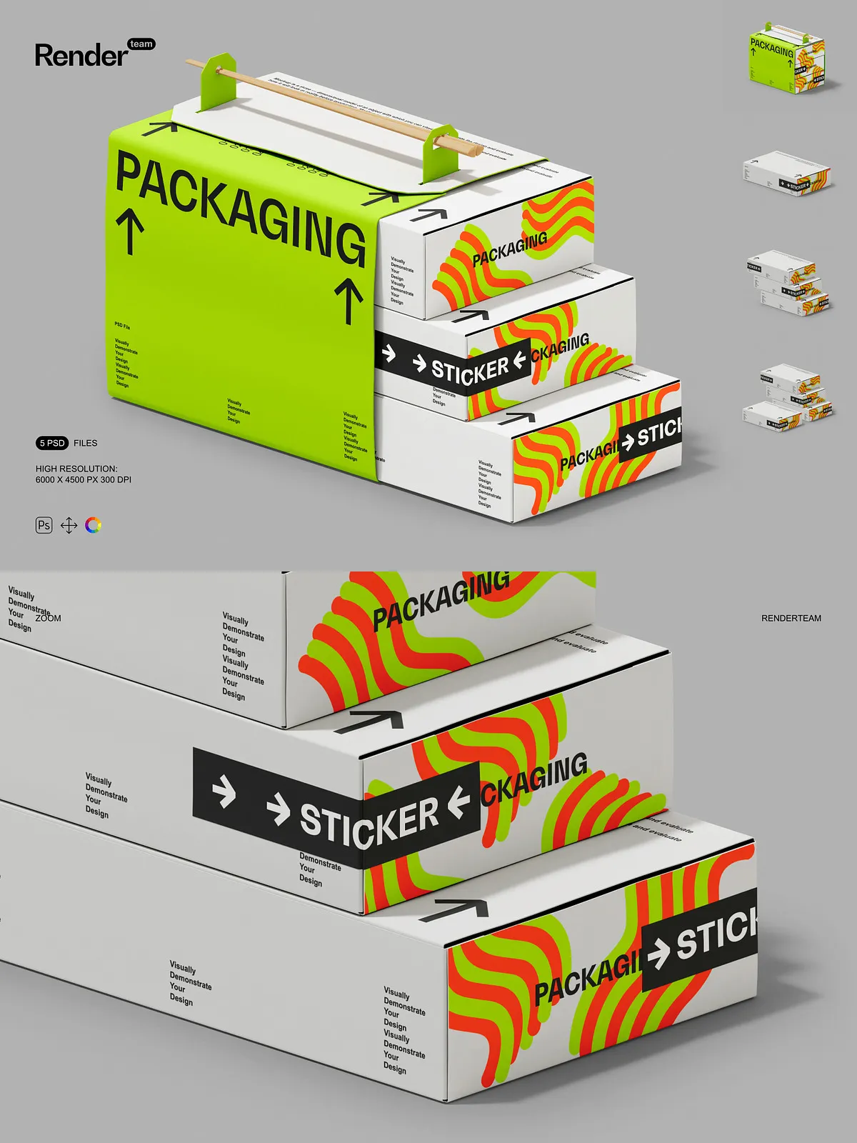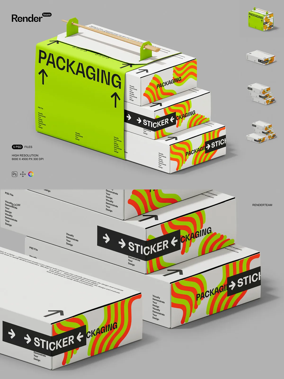 • 5 layered PSD mockup files showing multiple box orientations and presentation styles