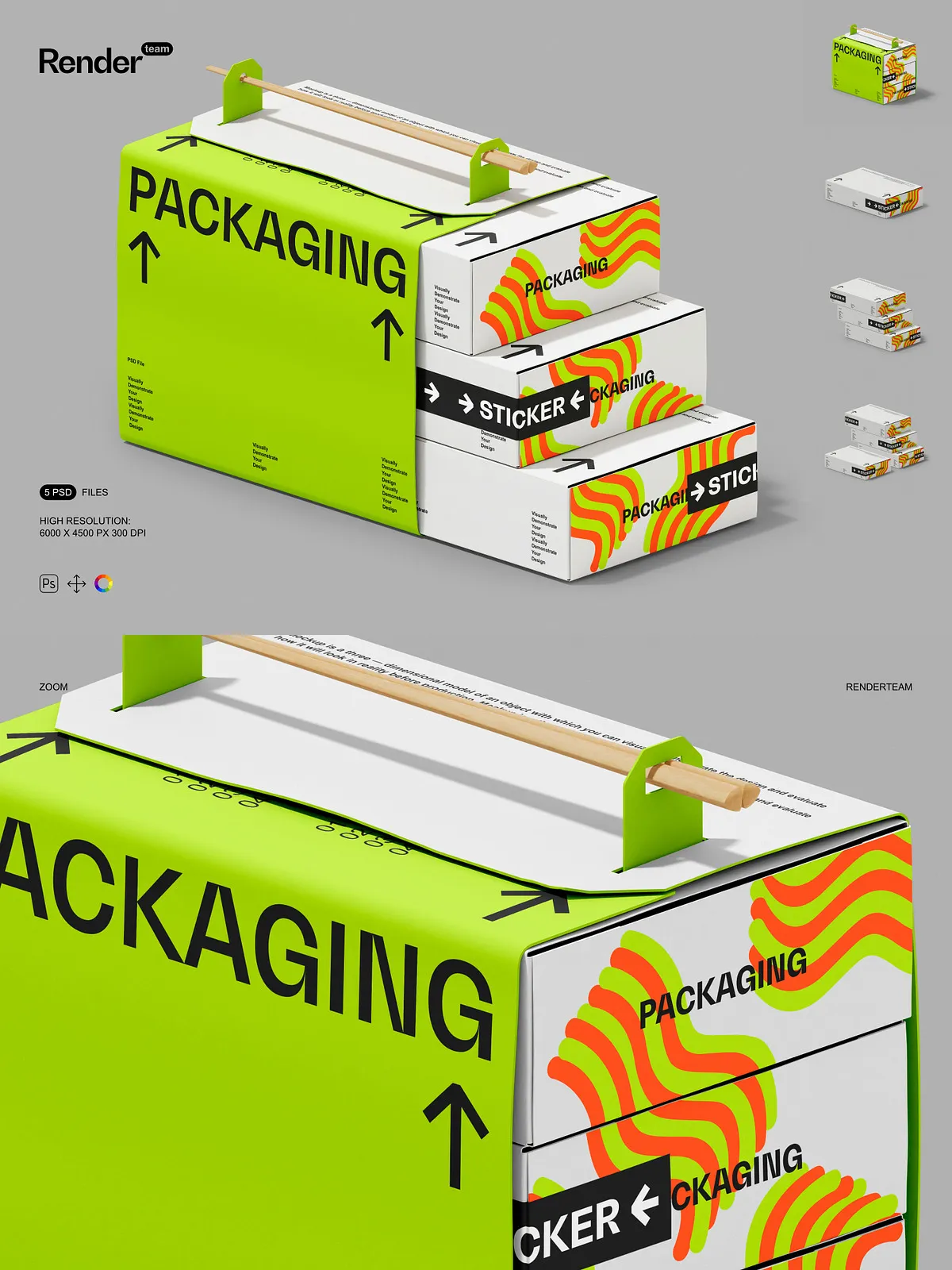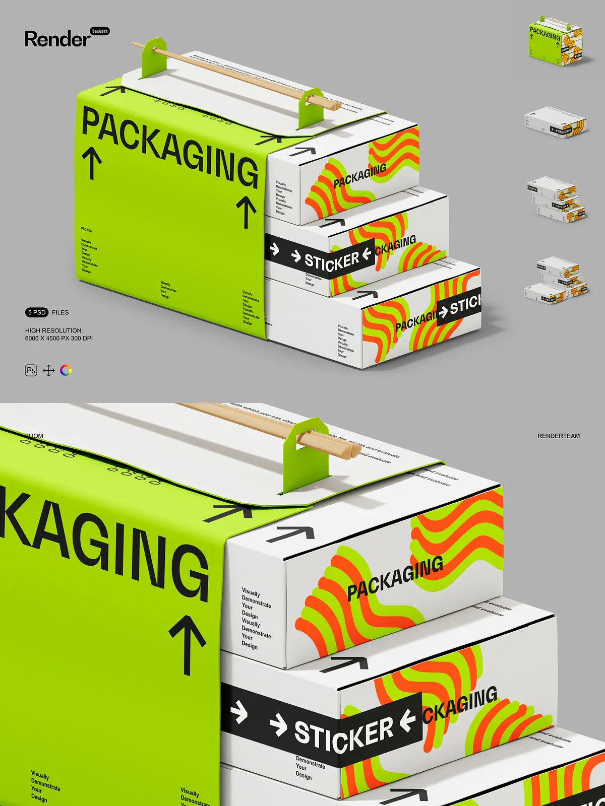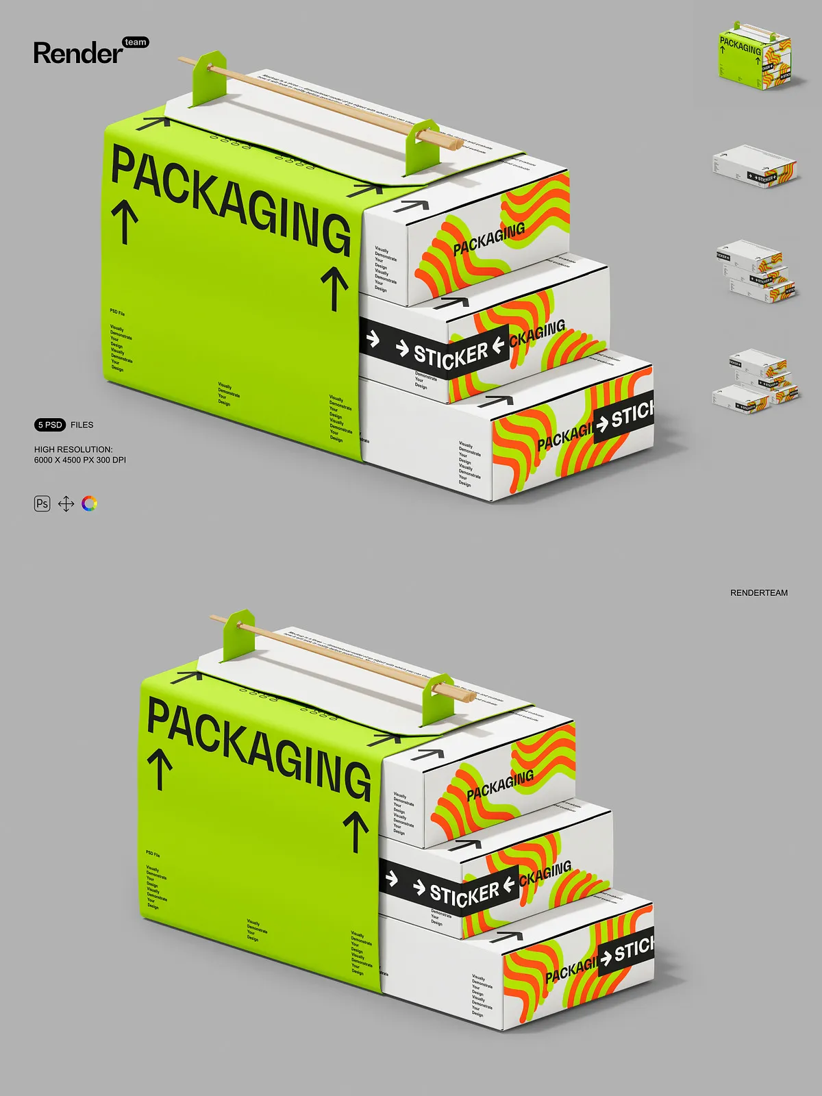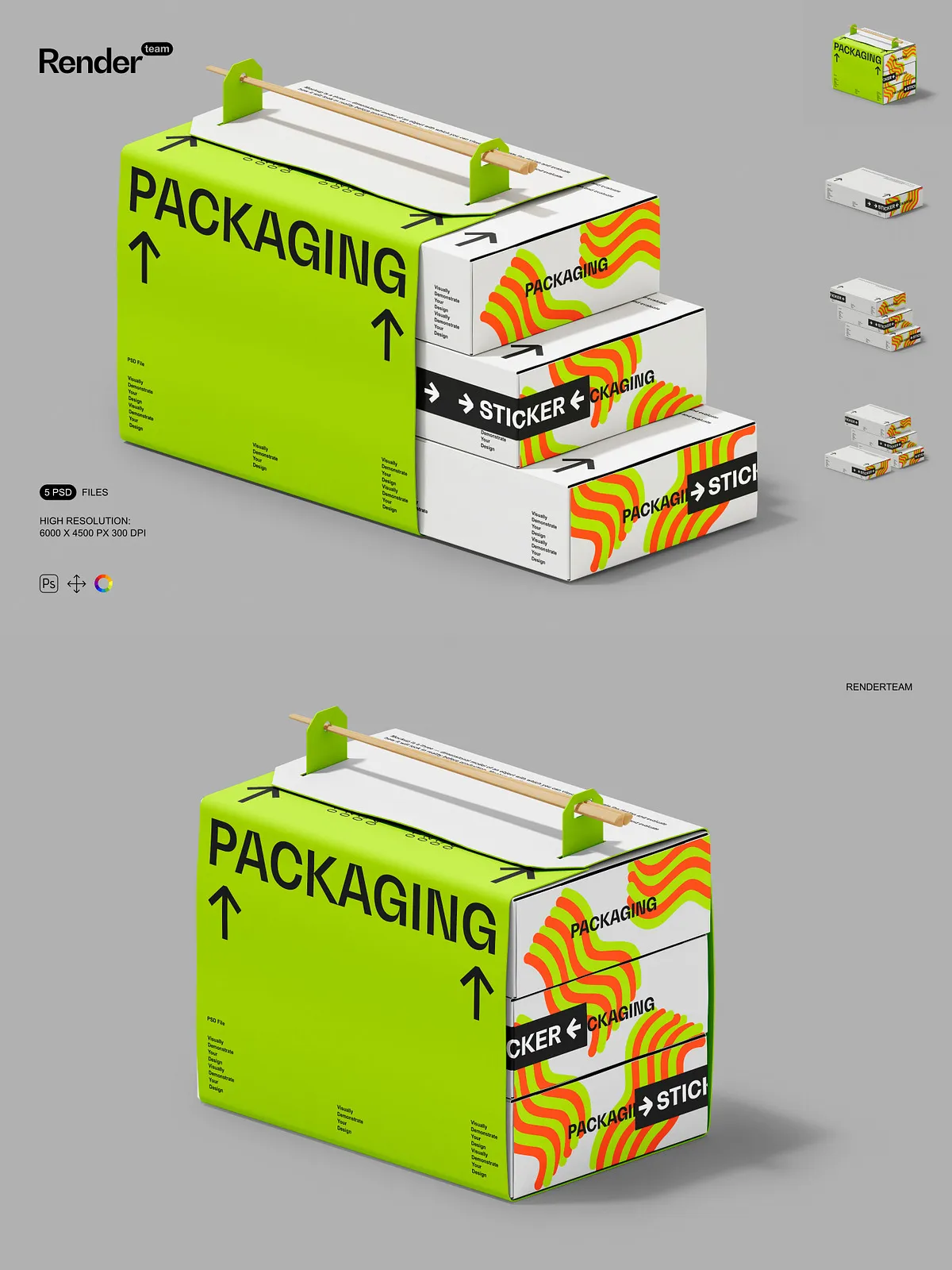 • 5 layered PSD mockup files showing multiple box orientations and presentation styles