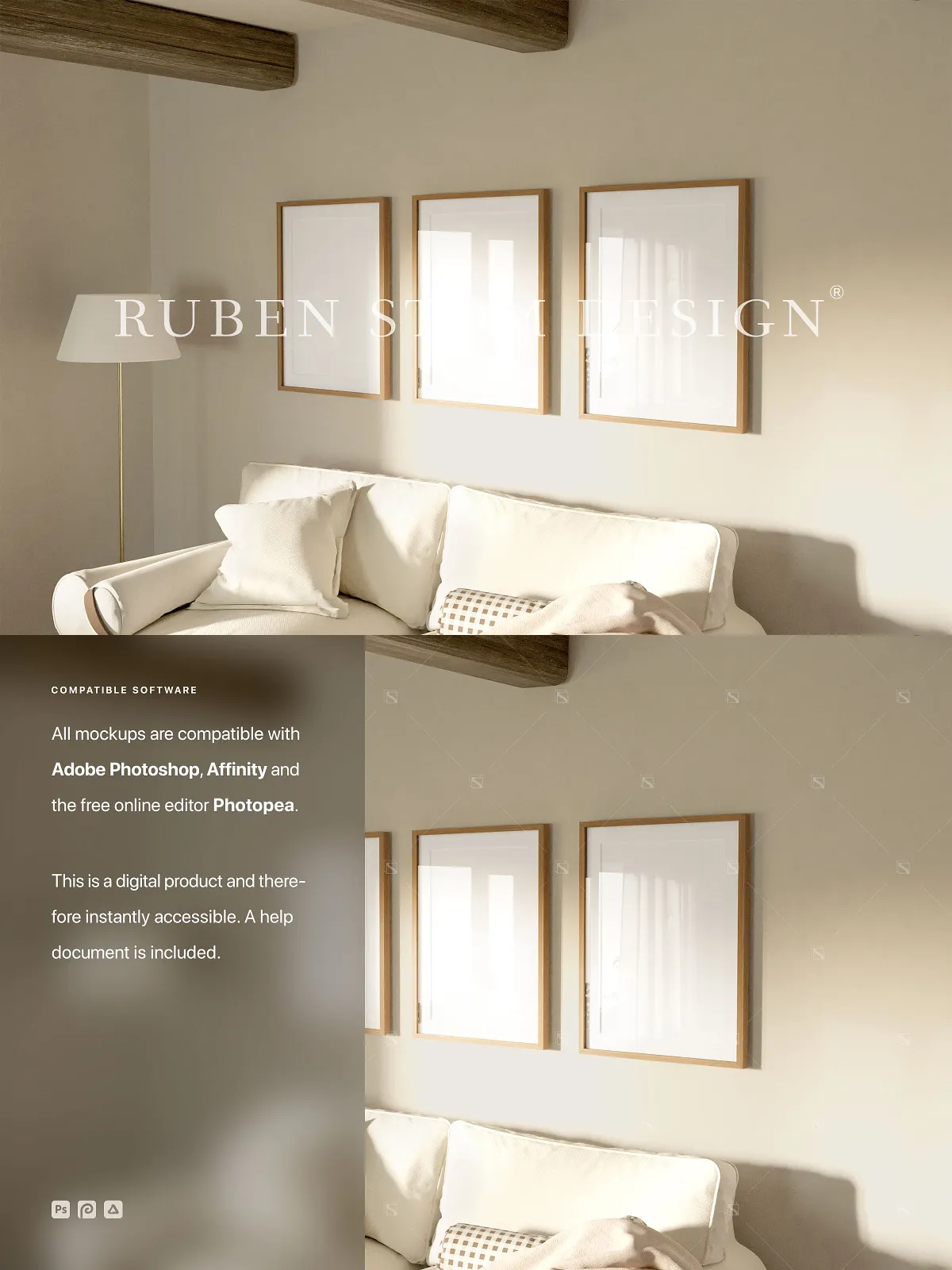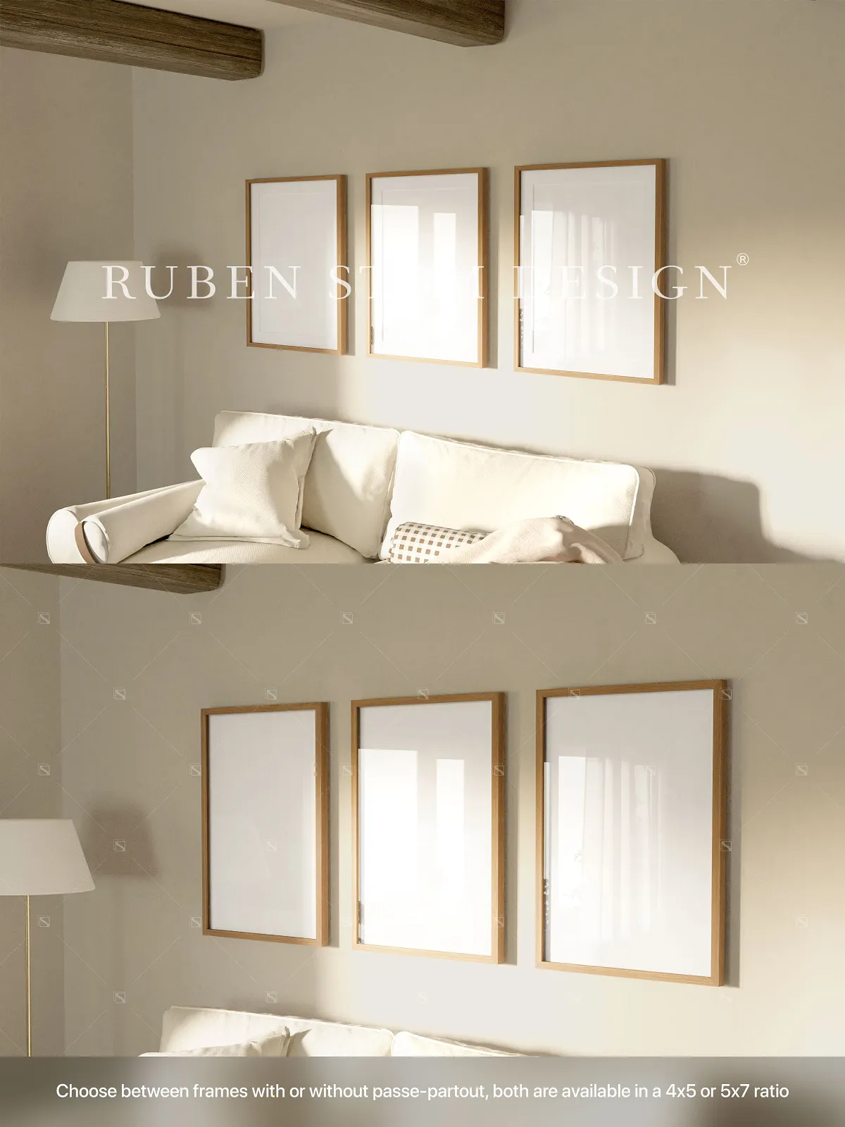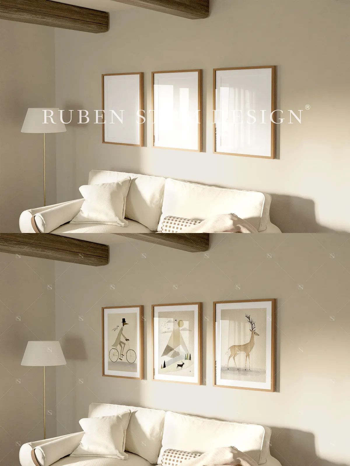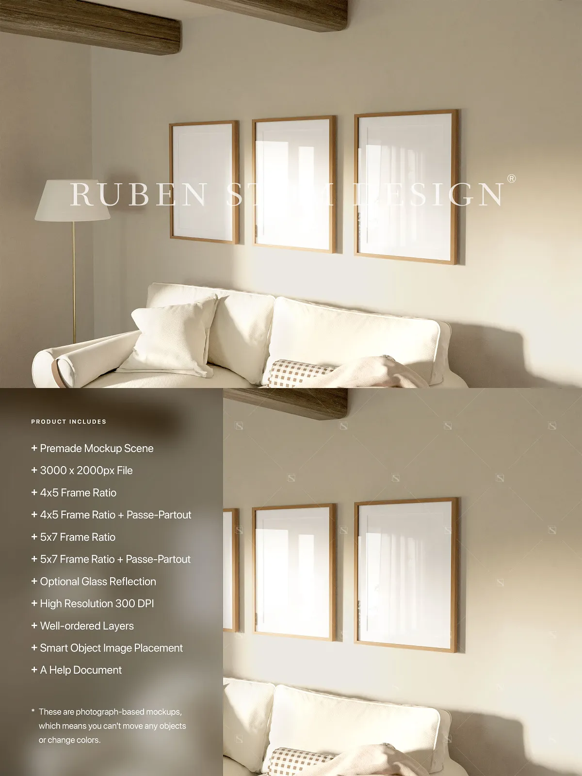 Keep in mind: This is a photograph-based mockup, meaning the background, frame, and physical scene are fixed. You cannot move, rotate, or alter the position of any objects. Colors of the frame, glass, and passe-partout are pre-defined and cannot be changed. Additionally, all placeholder images are for preview purposes only and are not included in the download to respect third-party licensing. This ensures both creative integrity and legal safety for every user.